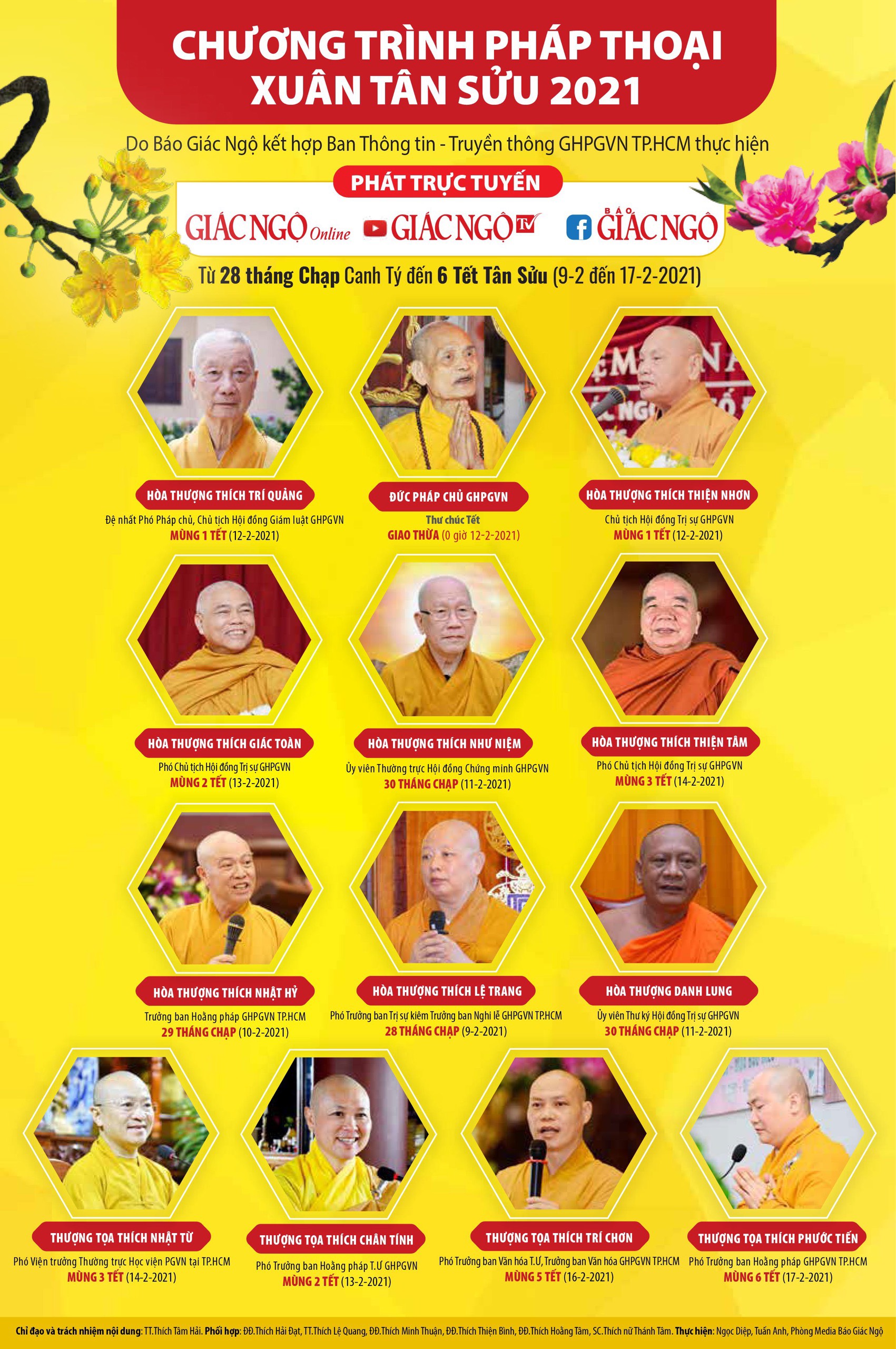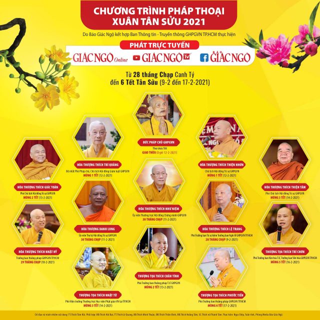 Theo đó, từ ngày 28 tháng Chạp năm Canh Tý đến mùng 6 Tết Tân Sửu (ngày 9 đến 17-2021) sẽ phát trực tuyến các thời pháp thoại của chư tôn đức Trưởng lão, quý Hòa thượng, Thượng tọa giảng sư.