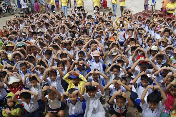 Dưới cái nắng gay gắt lúc 11h các em nhỏ vẫn rất ngoan và háo hức được phát quà. Chính tại ngôi trường này, đoàn đã ghi lại được những khoảnh khắc rực rỡ nhất của lồng đèn và bánh trung thu cùng các em.