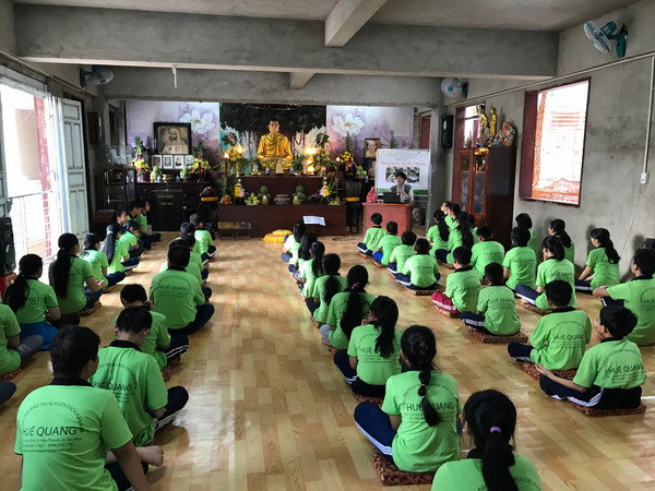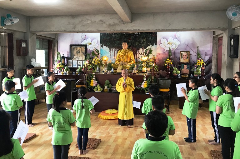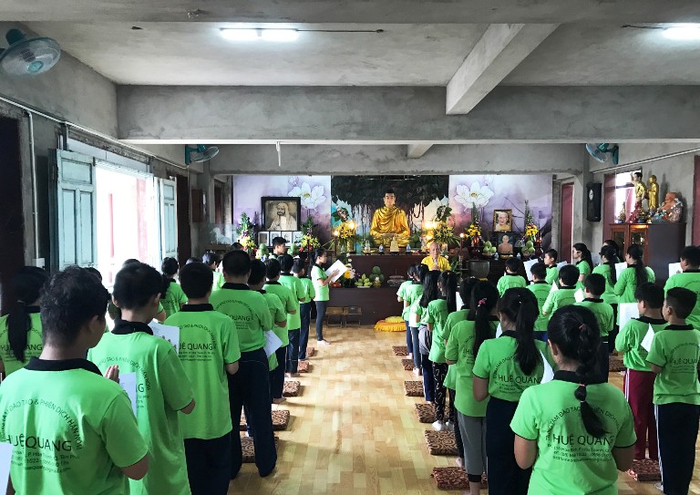 Trước giờ thuyết trình, các em dành 20 phút để tập trung niệm kinh tại chính điện.