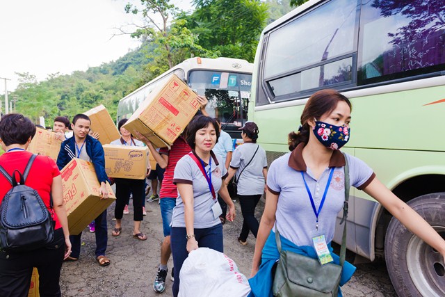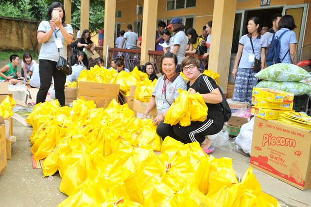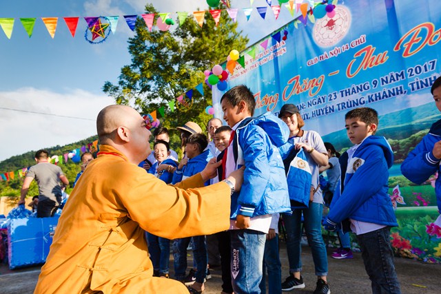 Ngay trong buổi sáng đầu tiên khi có mặt tại địa phương, đoàn thiện nguyện CLB Hà Nội 14 Chữ được phân công công việc và triển khai chia công tác chia quà cho tất cả 1012 học sinh của 6 điểm trường tại xã Trùng Khánh. Mỗi phần quà, bao gồm 01 áo ấm, bánh trung thu, các dụng cụ học tập cùng các đồ dùng cá nhân thiết thực phục vụ cuộc sống hàng ngày.