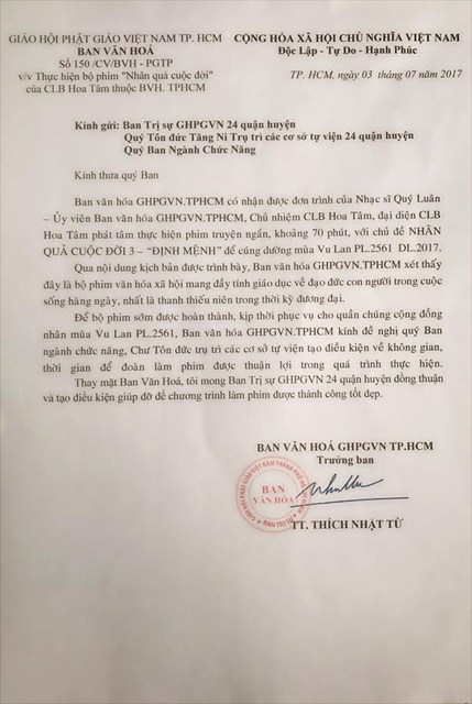 Nhận thấy nội dung bộ phim Nhân Quả Cuộc Đời 3 mang tính giáo dục về đạo đức con người trong cuộc sống hàng ngày, nhất là giáo dục cho tầng lớp thanh thiếu niên hiện nay hiểu thêm về luật nhân quả, để từ đó sống tốt, sống có ích cho gia đình và cho xã hội, nên Ban văn hóa GHPGVN thành phố Hồ Chí Minh đã ra công văn số 150/CV/BVH-PGTP gửi BTS các quận huyện, các chùa, tự viện, các cơ quan chức năng trên địa bàn thành phố Hồ Chí Minh tạo mọi điều kiện giúp đỡ CLB Hoa Tâm để CLB Hoa Tâm sớm hoàn thành bộ phim ý nghĩa này.