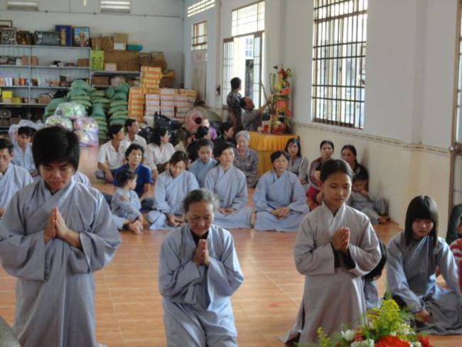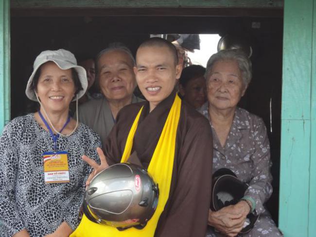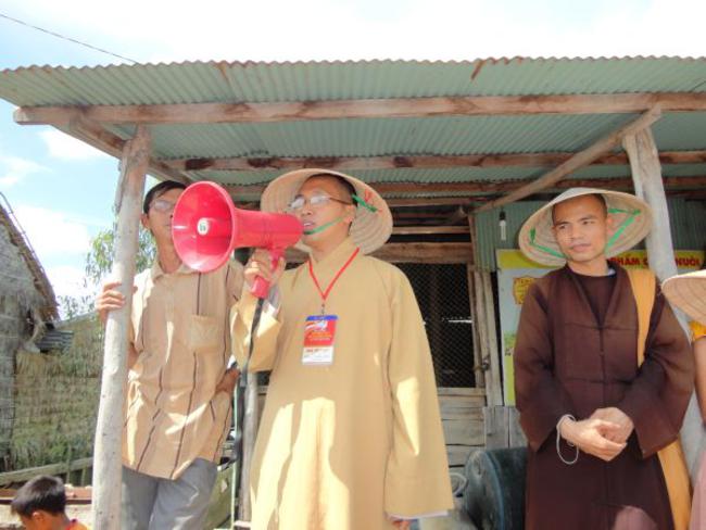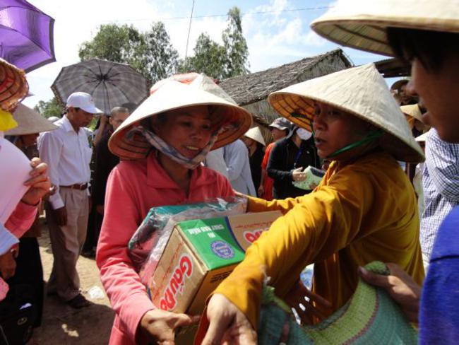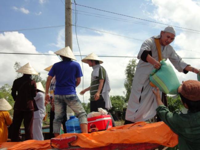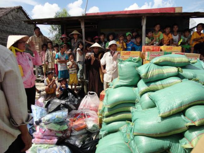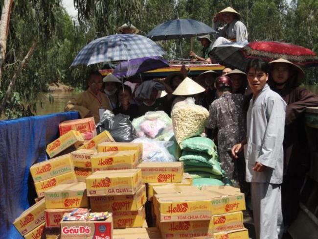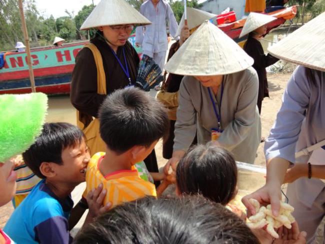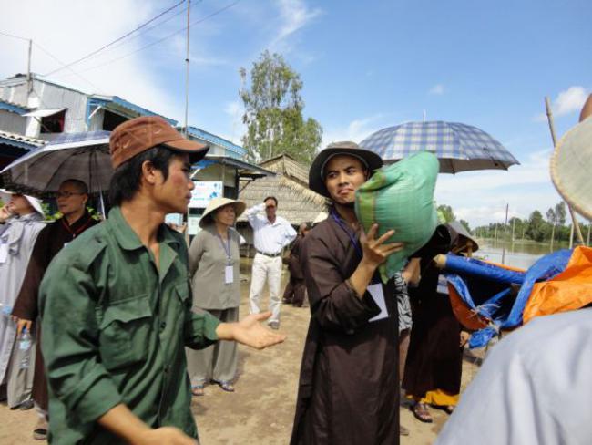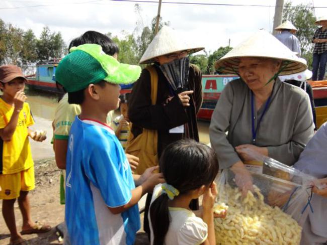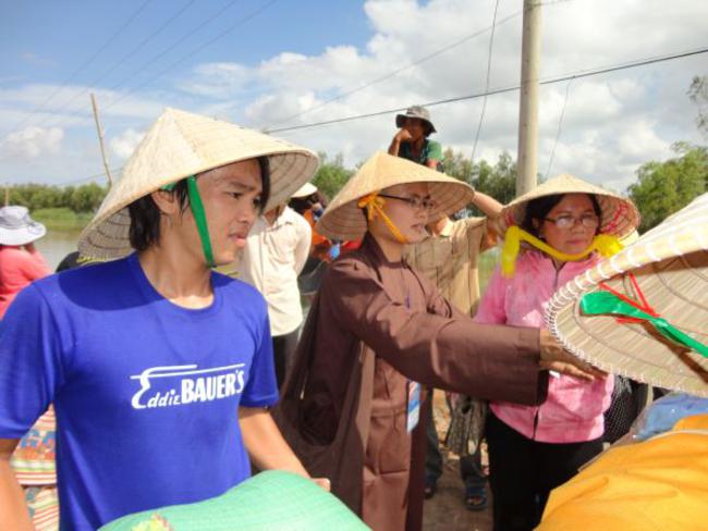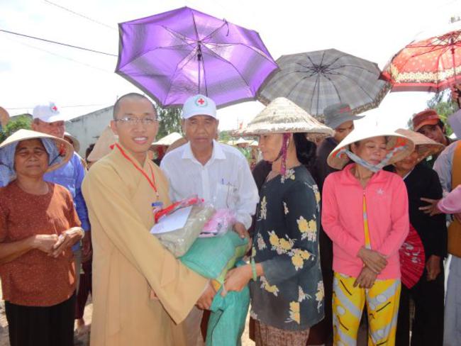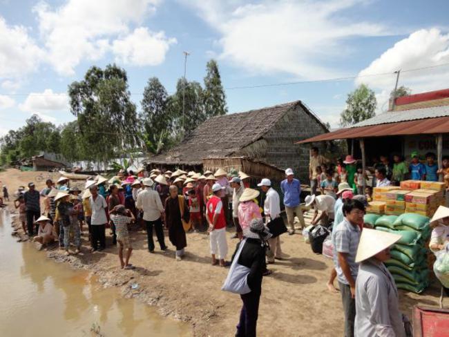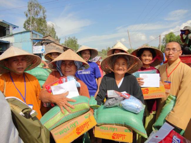 Chùa Quê Hương, Thị trấn Tràm Chim, huyện Tam Nông, tỉnh Đồng Tháp, do ĐĐ. Thích Thiện Xuân hướng dẫn phát quà.