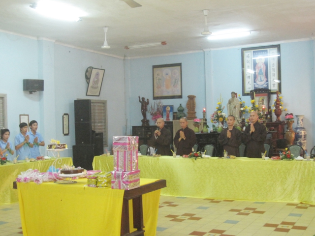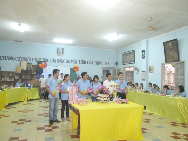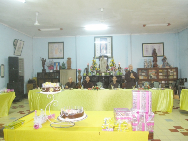 Ngay từ buổi sáng, các thành viên CLB tích cực chuẩn bị cho ngày lễ từ việc cắm hoa, trang trí hội trường đến việc chuẩn bị thức ăn liên hoan… Vào lúc 3h chiều buổi Tất niên cùng sinh nhật đã diễn ra trong không khí vui tươi, thân mật và ấm cúng, với sự tham dự của Thầy Hải Châu, Thầy Quảng Vượng -Phó Chủ nhiệm CLB, Thầy Tuệ Hạnh, T. Mãn Tâm và T. Quảng Ứng đại diện cho quý Thầy trong chùa cùng chung vui với CLB Phật Tử Trẻ.