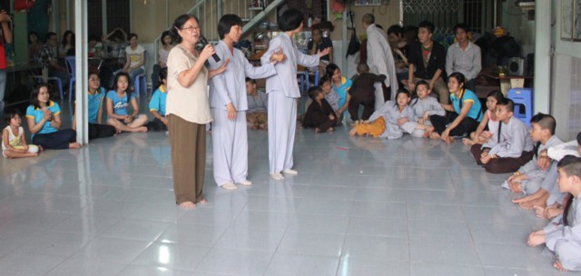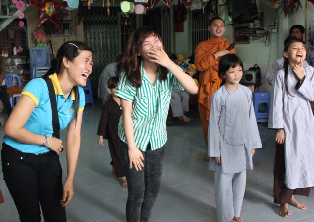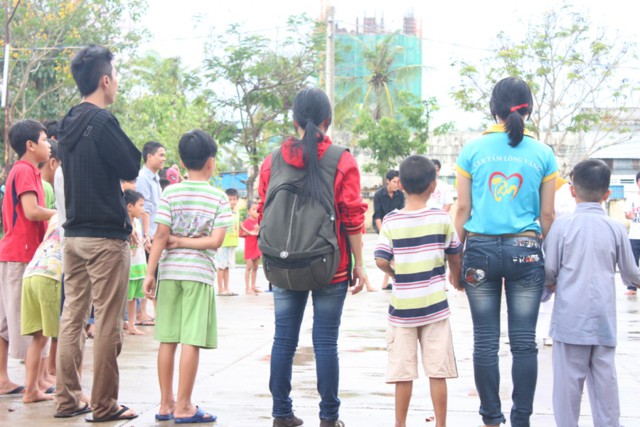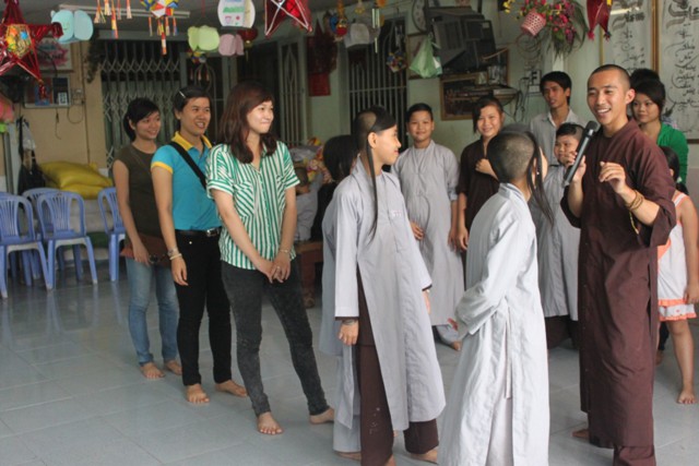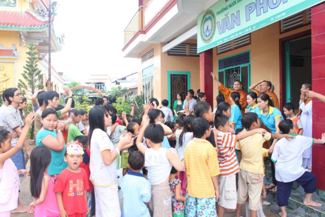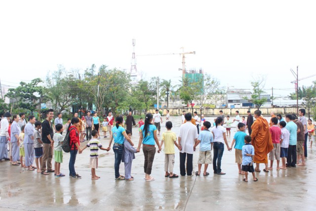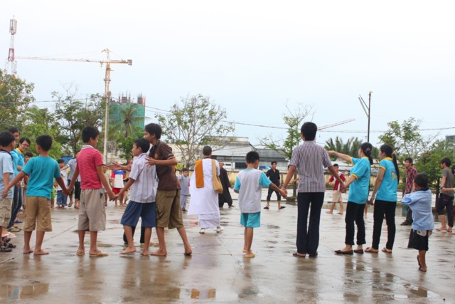 Đứng thành vòng tròn giữa cơn mưa nặng hạt, ĐĐ. Thích Minh Phú đã ra sức hướng dẫn các thành viên và hơn 150 em mồ côi tại Trường mồ côi Long Hoa, cùng chung sinh hoạt với các thành viên trong CLB, để các em không còn cảm thấy có khoảng cách, mà cùng hòa mình vào những trò chơi dân gian đầy sinh động và vui tươi.