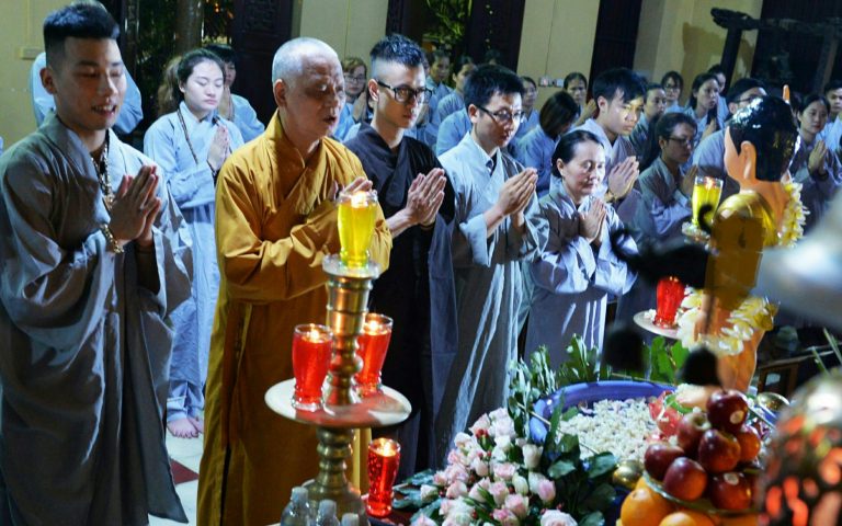 Buổi lễ có sự Chứng minh của HT.Thích Thanh Hưng – Ủy viên HĐTS TW GHPGVN – Phó Ban Hướng dẫn Phật tử T.Ư. Khóa lễ do Cư sĩ Diệu Nhân (Nguyễn Thị Xuân Loan) – UV HĐTS TW GHPGVN – Phó thư ký Ban Hướng dẫn Phật tử T.Ư, Phật tử Ngọc Hiếu, PT Tiến Bình; PT Cẩm Vân; cùng Ban chủ nhiệm CLB Thanh thiếu niên Phật tử chùa Quán Sứ và toàn thể thành viên CLB tổ chức trang nghiêm trọng thể, sau nghi lễ dâng hương, tụng kinh khóa lễ Phật đản, toàn thể hội chúng thành kính chắp tay lần lượt tiến vào lễ đài thực hiện nghi thức Tắm Phật trong không khí hân hoan tràn đầy đạo vị, hòa theo tiếng nhạc niệm Hồng danh Nam mô Bổn Sư Thích Ca Mâu Ni Phật.