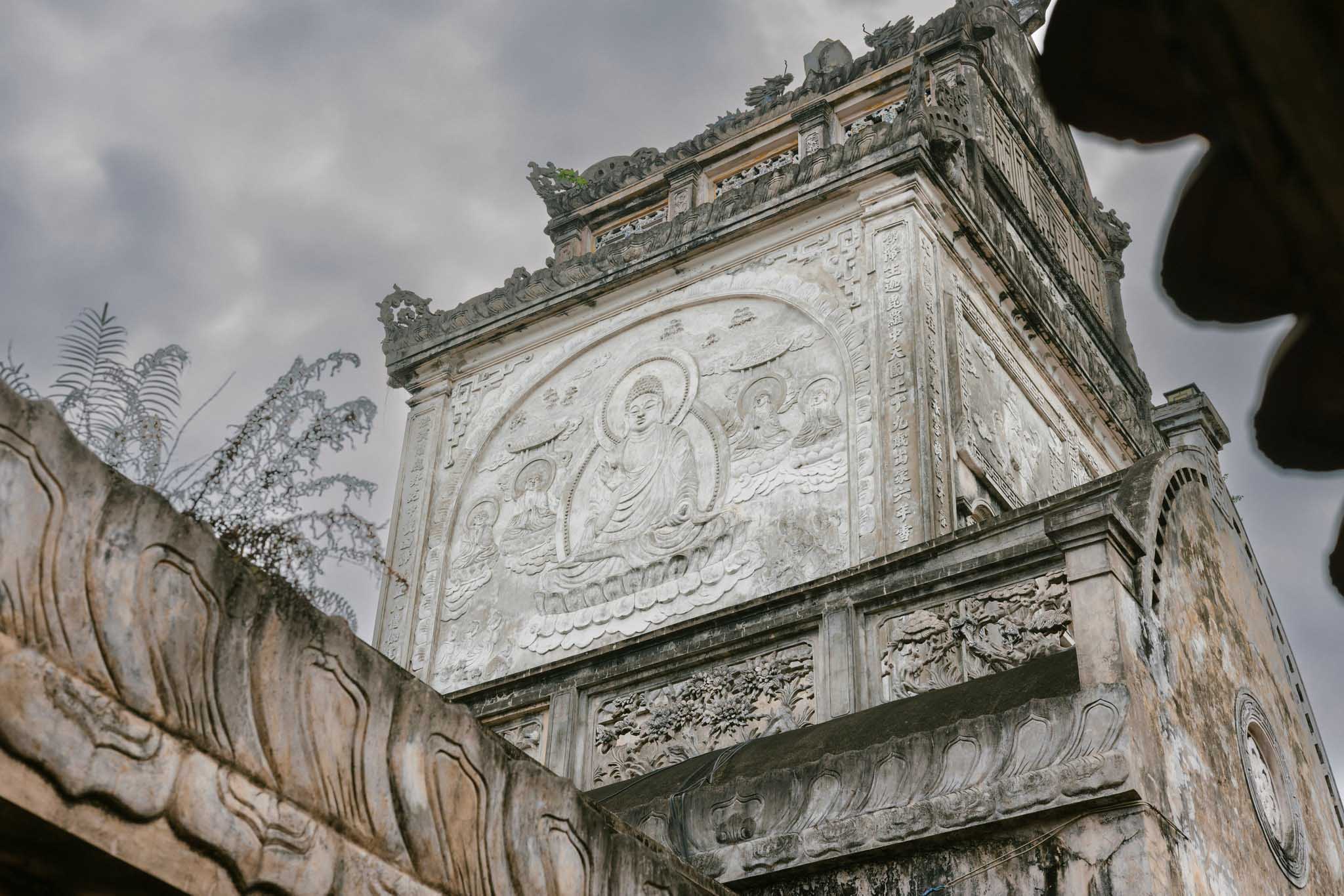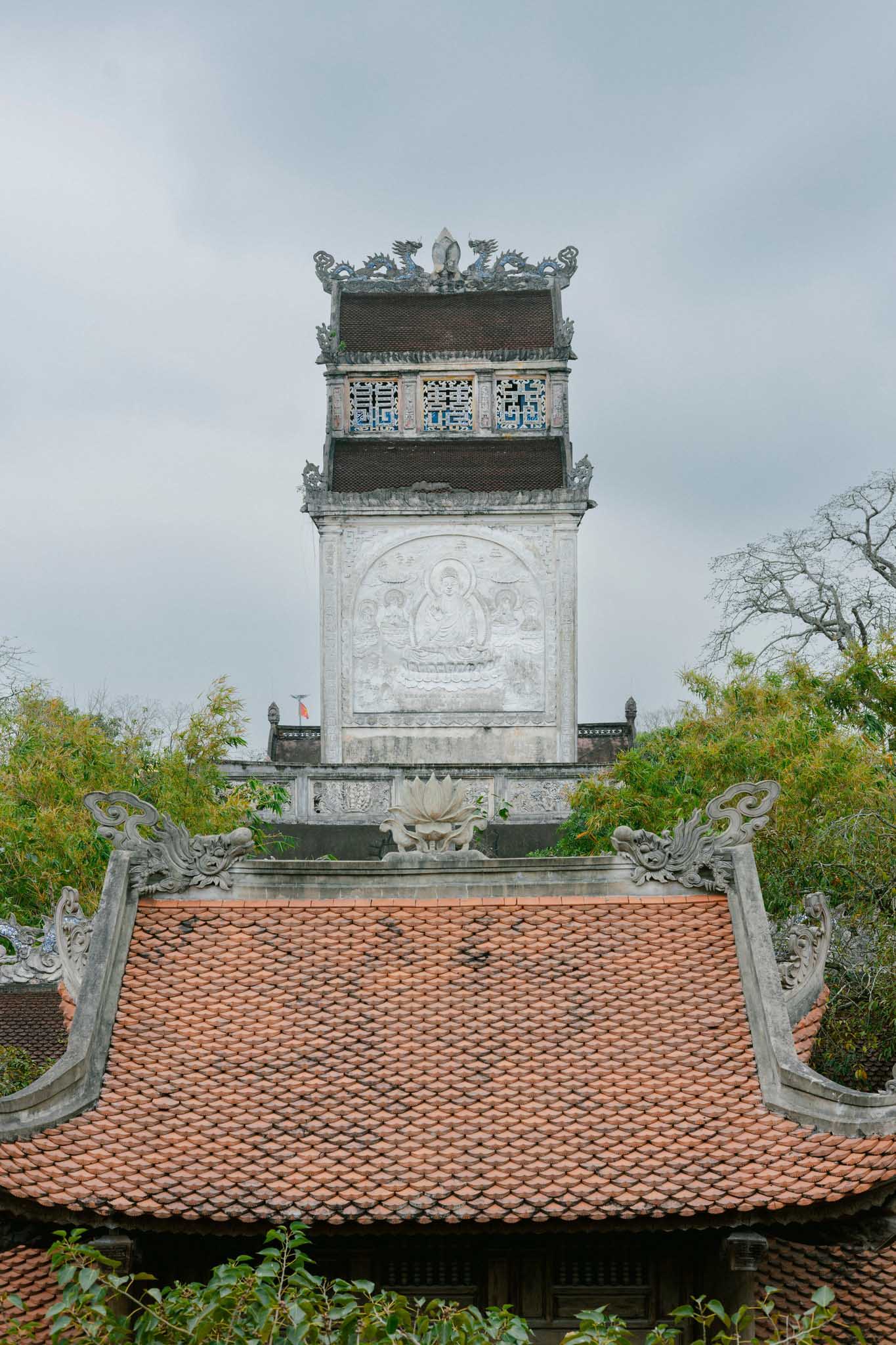 Tổng thể công trình chùa từ ngoài vào trong được sắp xếp theo thứ tự cổng chùa, tháp Cửu phẩm Liên hoa, cầu cuốn, tam quan, nhà hội quán, đền Thánh, đền Mẫu, hai cầu núi, chùa chính, nhà tổ, nhà khách, phòng tăng, pháp đường, tòa Kim chung bảo các, vườn tháp…