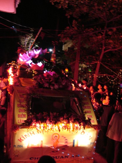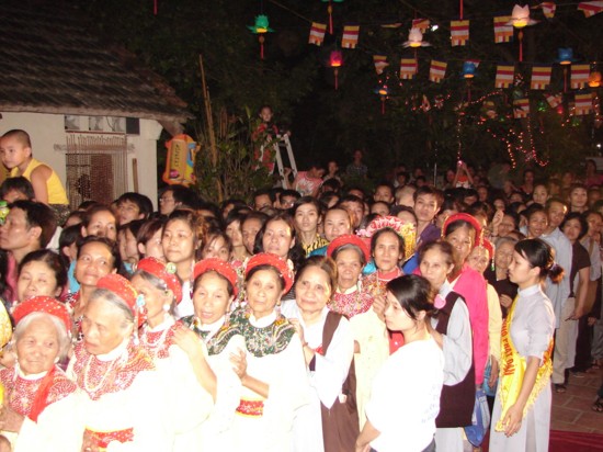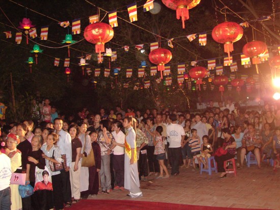 Sân chùa Quan Âm lúc 10 đêm giờ vẫn đông chật người dân chờ được tắm Phật. Ước mơ ngôi chùa nào cũng làm được như chùa Quan Âm, đưa lễ Phật đản từ chùa ra cộng đồng, kết hợp lễ hành chính với hội của quần chúng.