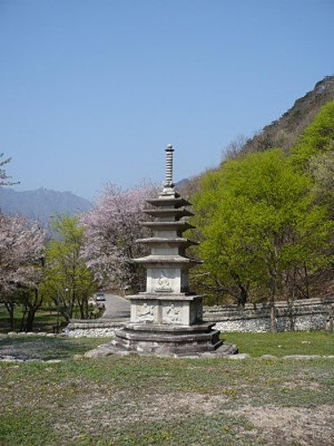 Nó bị đốt cháy vào năm 699, và được xây dựng lại vào năm 710, rồi sau này lại bị đốt cháy một lần nữa vào năm 1645 và được xây dựng lại năm 1648. Ngôi Cổ tự nằm trong khu Công viên Quốc gia Seonraksan, Gangwon-do Sokcho-si Seorak-dong.
