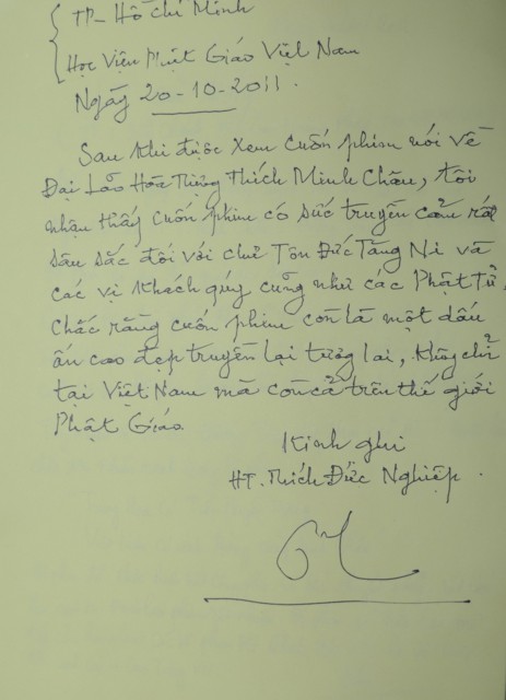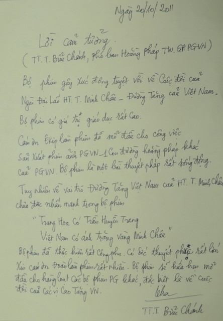 Nhiều vị Tôn đức, Tăng Ni và Phật tử đã ghi cảm tưởng, chúng ta lắng nghe HT. Thích Đức Nghiệp : “ … cuốn phim có sức truyền cảm rất sâu sắc đối với chư Tôn Đức Tăng Ni, các vị khách quý cũng như các Phật tử. Chắc rằng cuốn phim còn là một dấu ấn cao đẹp truyền lại tương lai không chỉ tại Việt Nam mà còn cả trên thế giới Phật giáo.”