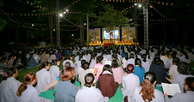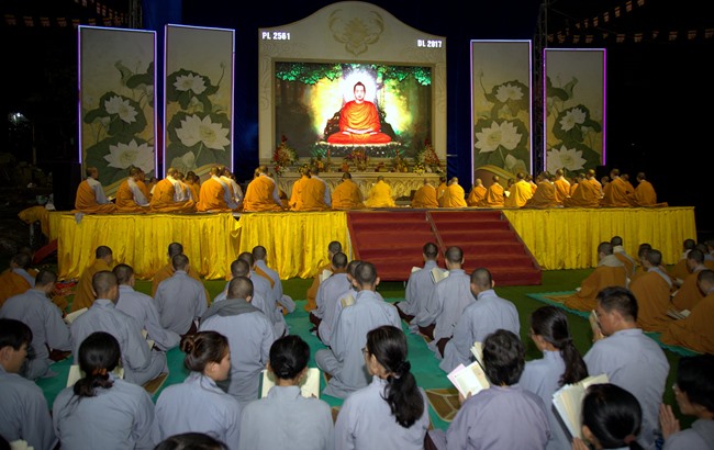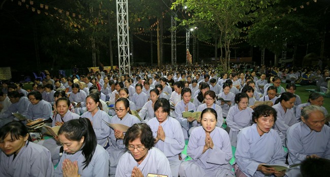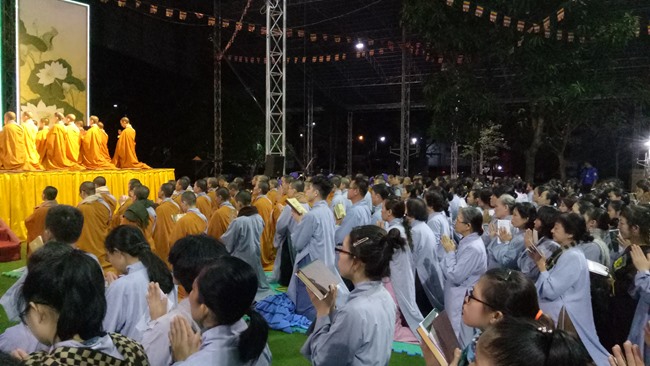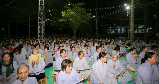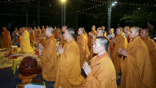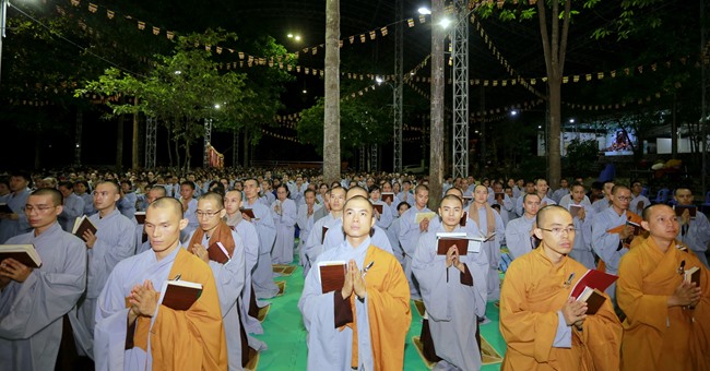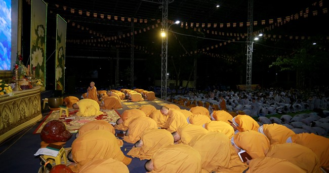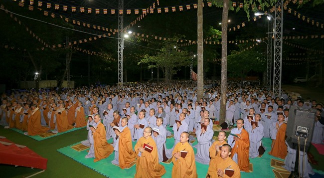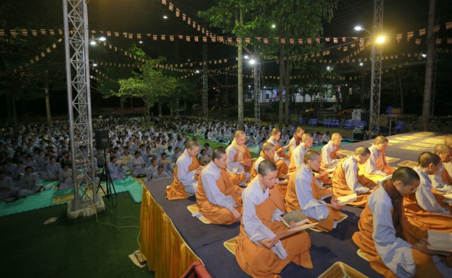 Khóa tụng kinh bắt đầu từ 12h00’ đêm đến 7h00’ sáng do HT Thích Viên Giác làm Chủ sám. Được biết, chư tôn đức Tăng Ni và phật tử chia thành 6 nhóm thay phiên nhau tụng kinh suốt đêm trong sự thành kính trang nghiêm.