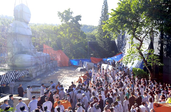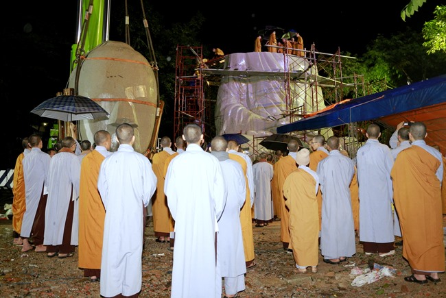 Để thực hiện nâng lắp khối đầu và hai khối vai, vào tối ngày 30/09/2017, HT Thích Viên Giác, TT Thích Chân Quang cùng các nghệ nhân điêu khắc đã nhanh chóng kiểm tra các khâu thật kỹ lưỡng, đồng thời tổ chức khóa tụng kinh cầu nguyện. Hơn 2500 người (bao gồm phật tử gần xa và Chúng thanh niên phật tử Phật Quang) đã tề tựu tại Thiền tôn Phật Quang, tham dự khóa tụng kinh cầu cho công trình xây dựng tượng Đức Phật Bổn Sư Thích Ca Mâu Ni được thành tựu viên mãn.