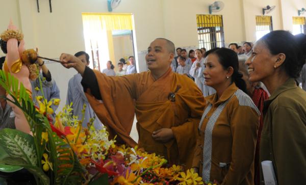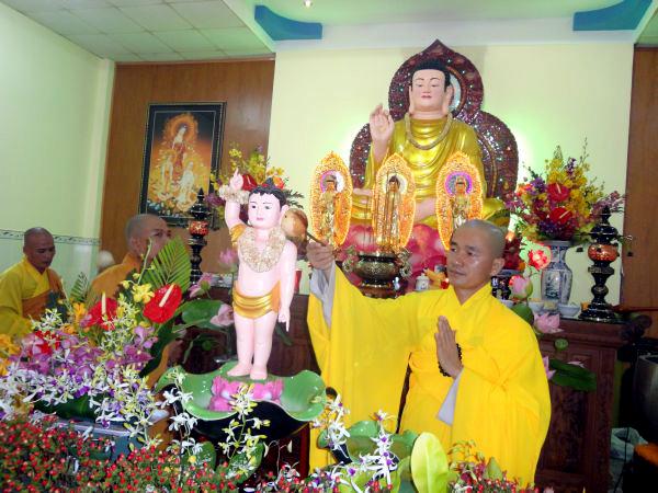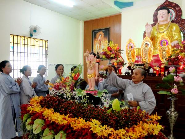 Lễ tắm Phật được bắt đầu trong tiếng niệm Phật rền vang. Mọi người không ai bảo ai, tuần tự xếp hàng rồng rắn, chắm tay trang nghiêm trước ngực, chờ đến lượt mình được tắm cho vị Phật sơ sinh. Ý nghĩa của việc tắm Phật như rũ bỏ đi những phiền muộn lo âu trong cuộc đời. Dùng nước cam lồ rưới sạch mọi trần cấu tham, sân, si, trở về với cái tâm vô nhiễm như thuở ban sơ ta mới lọt lòng. Chân như Phật tánh ở đó, khổ đau, than oán không còn đeo mang, cuộc đời là những tháng ngày thanh tịnh.