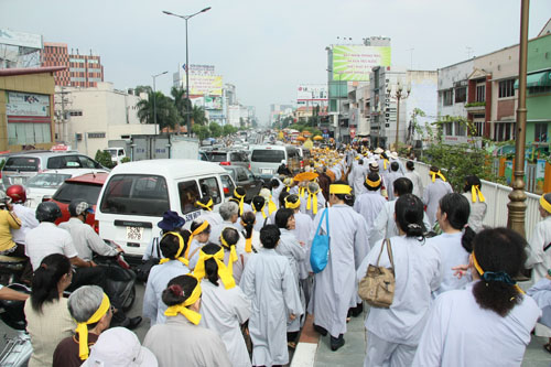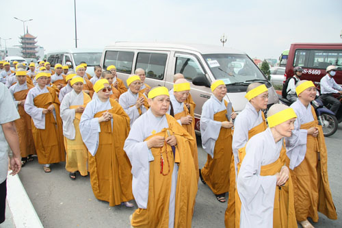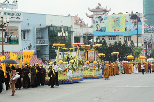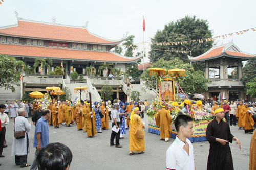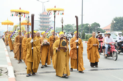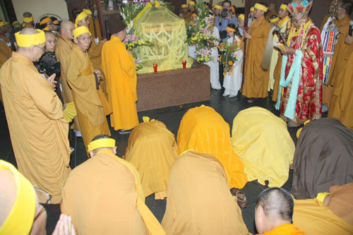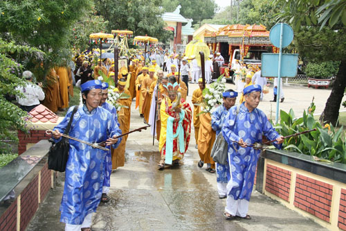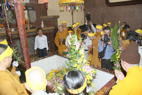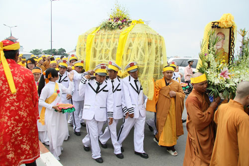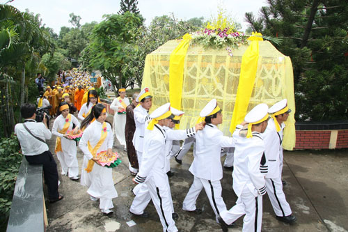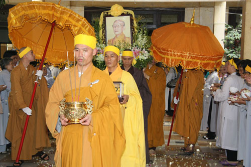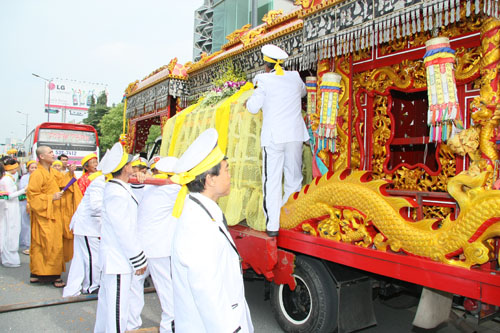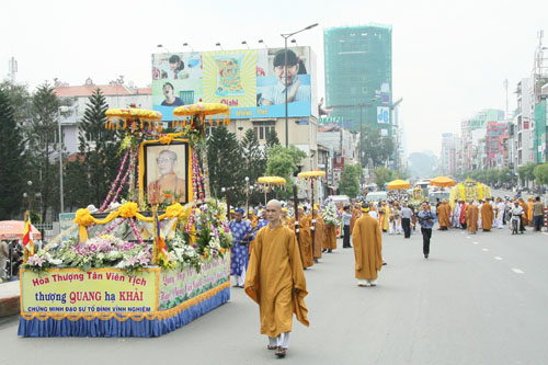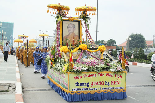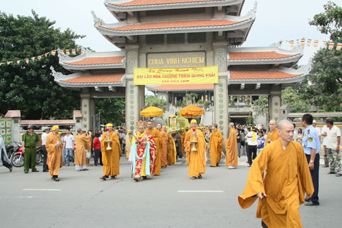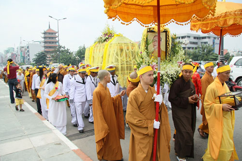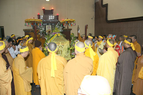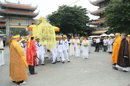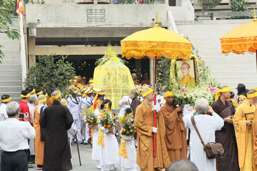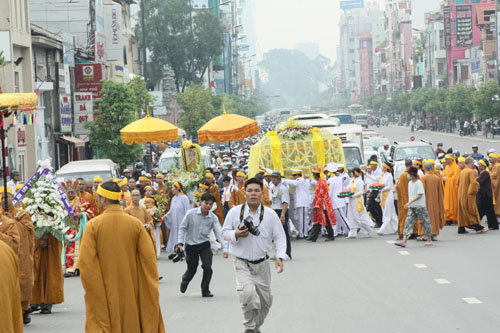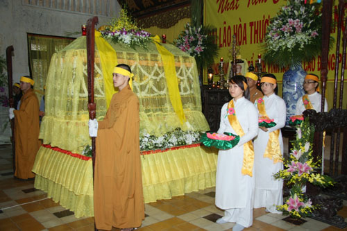 Sau phần cung tuyên tiểu sử của Đại lão Hòa thượng, điếu văn cảm niệm ân sư, cảm tạ của Ban tổ chức, cung tuyên pháp ngữ, niêm hương cúng dường, kim quan nhục thân Hòa thượng được cung tống tới Đài hỏa táng Bình Hưng Hòa để làm lễ trà tỳ.