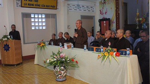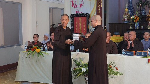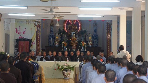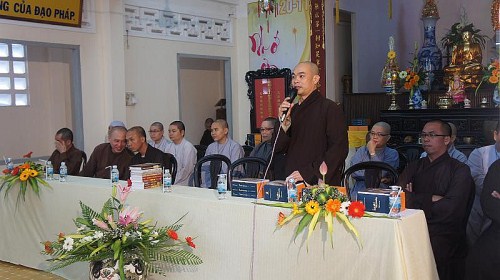Hòa thượng hiệu trưởng Thích Minh Thông đã mở đầu chương trình bằng lời giáo huấn đầu năm và phần quà là bộ luật ngũ phần cho đoàn, ngụ ý hành giả dù ở nơi nào, hành trì giới luật vẫn là điều kiện tiên quyết cho sự hoằng truyền phật pháp.