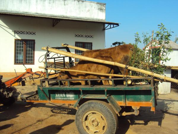 Đôi bò được đưa lên máy cày đưa về buôn Prên A trong niềm vui của tất cả mọi người.