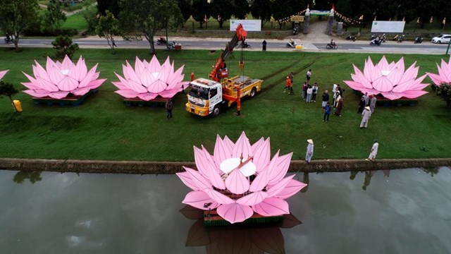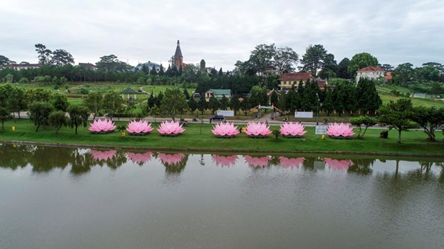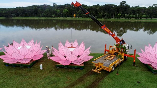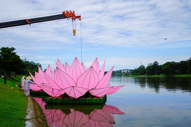 Đại Đức Thích Tĩnh Tuệ – Trưởng ban Văn Hóa GHPGVN Tp. Đà Lạt cho biết đây là năm thứ 3 thành phố Đà Lạt thả hoa sen mừng Phật đản. Mỗi đóa sen rộng 7m, cao 5m, gồm 28 cánh sen, nặng hơn 1 tấn được làm từ khung inox và bọc vải hồng, đặt trên bè nỗi được neo tại vị trí ấn định trên hồ xuân hương.