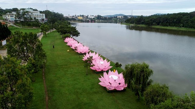 *19 giờ 00: Lễ thắp sáng 7 đóa hoa sen tại Hồ Xuân Hương (trước công viên Yersin)