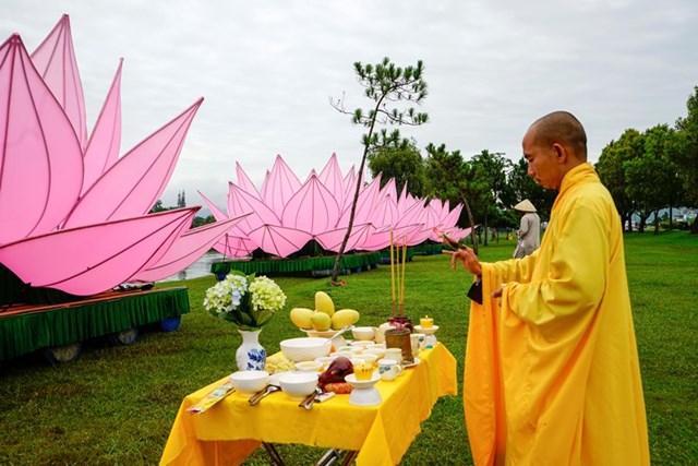 Từ sáng sớm, Chư Tôn Đức trong ban trị sự đã niêm hương làm lễ hạ thủy 7 đóa sen xuống hồ Xuân Hương.