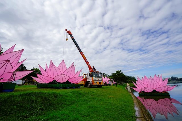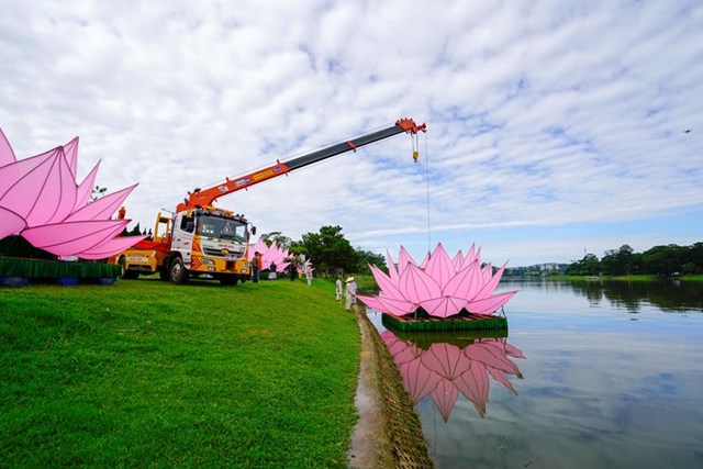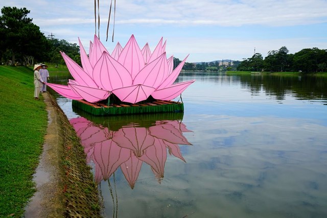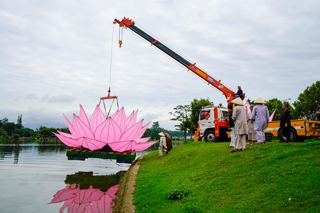 Đại Đức Thích Tĩnh Tuệ – Trưởng ban Văn Hóa GHPGVN Tp. Đà Lạt cho biết đây là năm thứ 3 thành phố Đà Lạt thả hoa sen mừng Phật đản. Mỗi đóa sen rộng 7m, cao 5m, gồm 28 cánh sen, nặng hơn 1 tấn được làm từ khung inox và bọc vải hồng, đặt trên bè nỗi được neo tại vị trí ấn định trên hồ xuân hương.