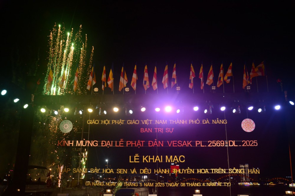 Trước lúc 7 đóa sen hồng trên sông Hàn được thắp sáng, 600 dàn pháo hoa được bắn lên không trung rực sáng sông Hàn, 12 chiếc thuyền hoa trang trí các biểu tượng theo lịch sử của Đức Phật Bổn Sư Thích Ca Mâu Ni lần lượt diễu hành quanh dòng sông Hàn trong niềm hoan hỷ của Tăng Ni, Phật tử các giới thành phố Đà Nẵng bởi đây là một trong những sự kiện quan trọng trong dịp Đại lễ Phật đản Vesak PL.2569 tại thành phố Đà Nẵng.