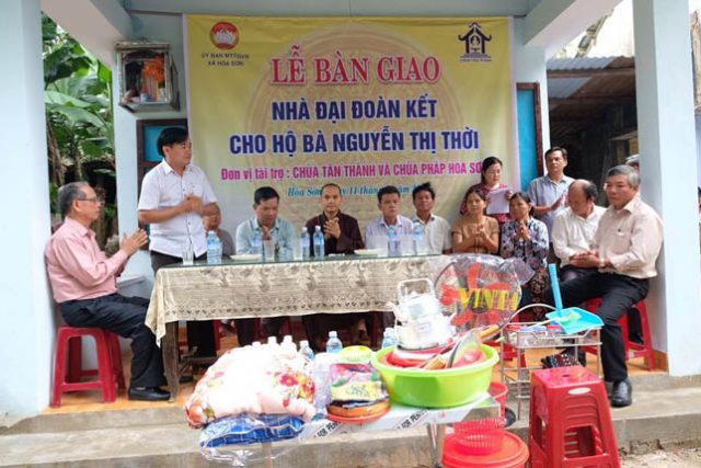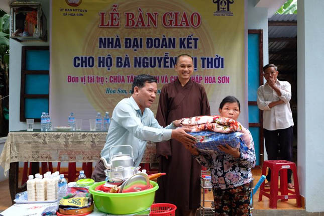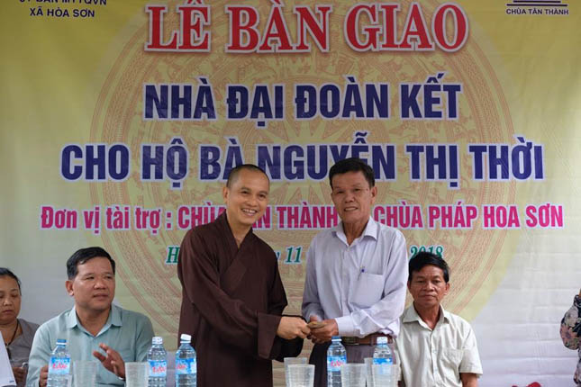 Vừa qua, chùa Tân Thành (Q. Thanh Khê, Tp Đà Nẵng) và chùa Pháp Hoa Sơn (huyện Hòa Vang, Tp Đà Nẵng) đã tỏ chức bàn giao ngôi nhà Đại đoàn kết cho hộ bà Nguyễn Thị Thời trú tại thôn Xuân Phú, xã Hoà Sơn, huyện Hoà Vang, Tp. Đà Nẵng.