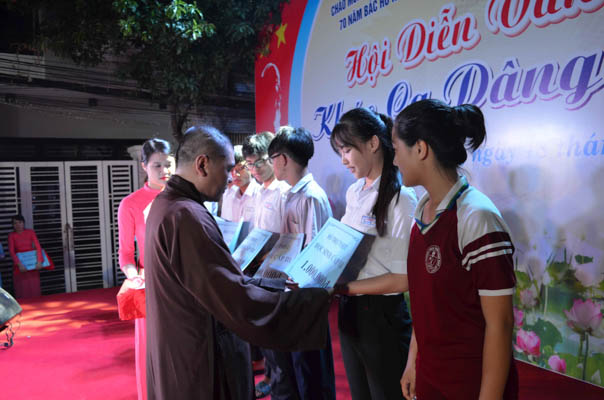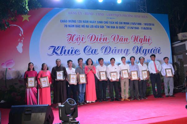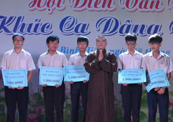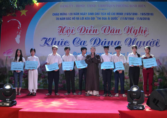 Tại đêm Hội diễn văn nghệ kỷ niệm 128 năm ngày sinh Chủ tịch Hồ Chí Minh (19/5/1890 – 19/5/2018) và 70 năm ngày Bác Hồ ra lời kêu gọi ” Thi đua ái quốc (11/6/1948 – 11/6/2018), đồng thời phát động “Quỹ Vì Người Nghèo” của địa phương, ĐĐ. Thích Đồng Nghĩa đã ủng hộ quỹ Vì người nghèo 10 triệu đồng và trao tặng 50 suất học bổng (mỗi suất 1 triệu đồng) cho các em sinh viên – học sinh nghèo hiếu học trên địa bàn phường.