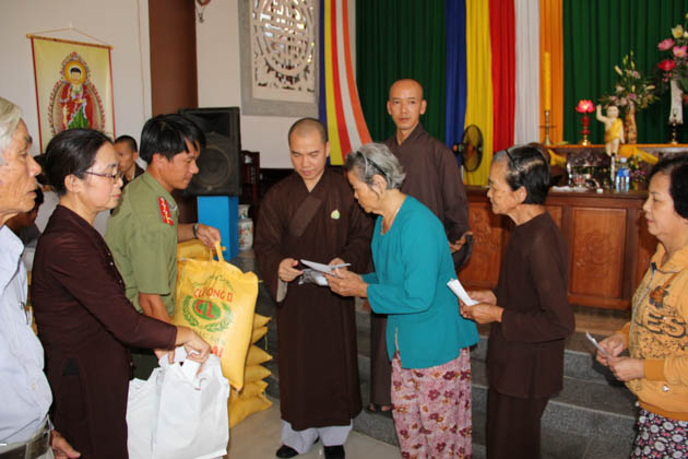 Sau đó, đoàn đã đến chùa Giác Nguyên (Thị trấn Hà Lam, huyện Thăng Bình, tỉnh Quảng Nam) thăm và trao tặng 200 suất quà trị giá 300.000đ/suất cho bà con có hoàn cảnh khó khăn tại địa phương.