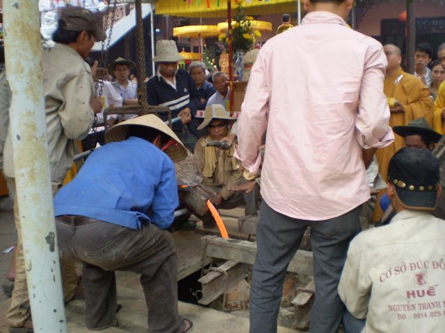 Đúng 9 giờ, lễ cầu nguyện và nghi thức sái tịnh bắt đầu, sau đó, các nghệ nhân tiến hành rót đồng vào khuôn.
