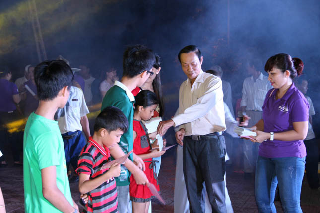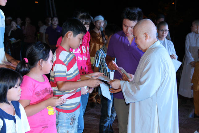1.500 phần quà đã được Ban tổ chức trao tặng đến các cháu thiếu nhi tại địa phương, các em đoàn sinh GĐPT quận Liên Chiểu. Cũng trong đêm hội, chùa Quang Minh cũng đã trao tặng 50 suất học bổng trị giá 600.000đ/suất do Công ty bánh mỳ Đồng Tiến tài trợ đến các em học sinh mồ côi cha mẹ. Chương trình trao học bổng là một hoạt động thường niên mà chùa Quang Minh đã thực hiện trong 5 năm qua.