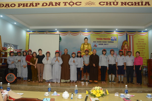 BTC cũng đã trao tặng mũ bảo hiểm cho đạo hữu Phật tử nhằm nhắc nhở mọi người đội mũ bảo hiểm khi tham gia giao thông.