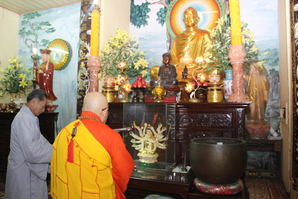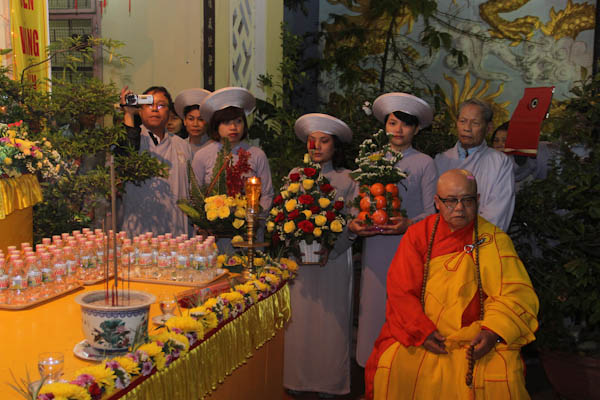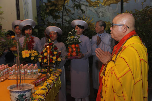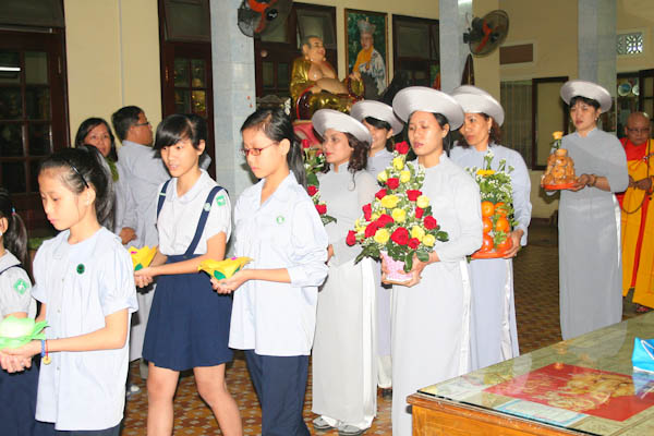 Sau phần diễn văn chào mừng, đạo tràng chùa Viên Quang đã dâng lục cúng và GĐPT Viên Quang đã dâng hoa cúng dường Tam Bảo. Tiếp theo, Thượng tọa Thích Minh Thành đã niêm hương bạch Phật và tiến hành nghi lễ cúng dường.