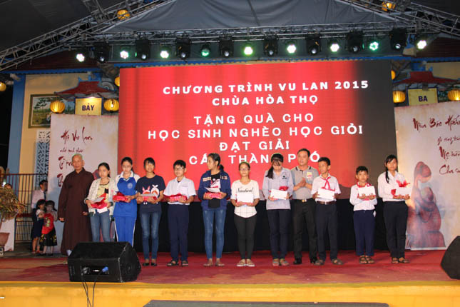 Tại đêm văn nghệ, chùa Hòa Thọ đã trao tặng 17 phần quà cho các em học sinh nghèo vượt khó trên địa bàn phường Hòa Thọ Tây. Mỗi phần quà trị giá 800.000đ. Trước đó vào buổi chiều, chùa Hòa Thọ cũng đã trao tặng 150 phần quà với tổng trị giá 45 triệu đồng đến những phụ nữ có hoàn cảnh khó khăn.