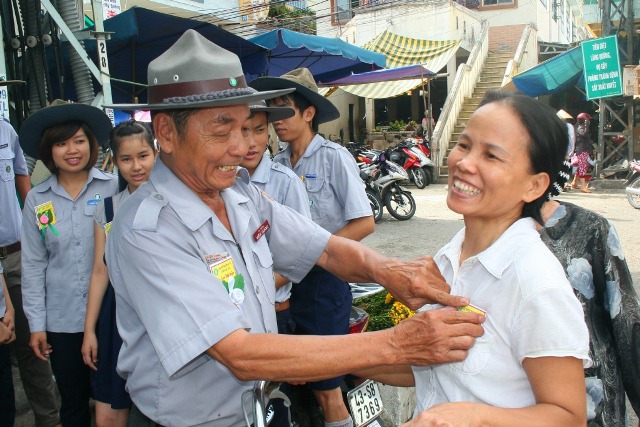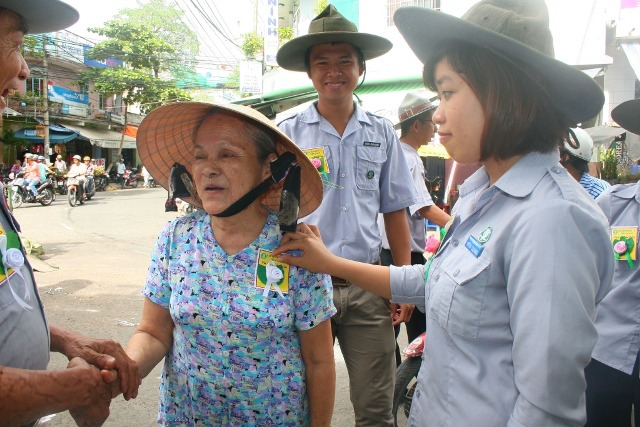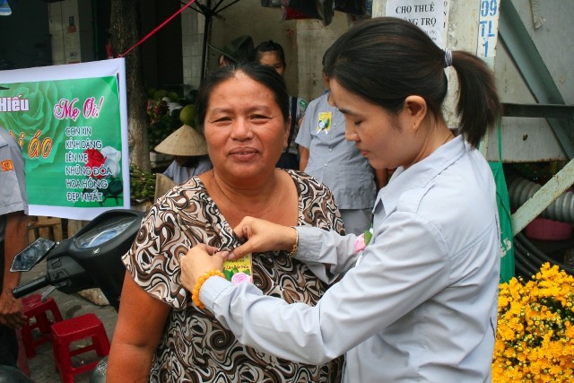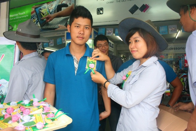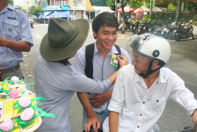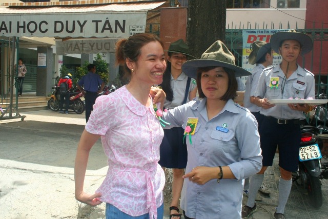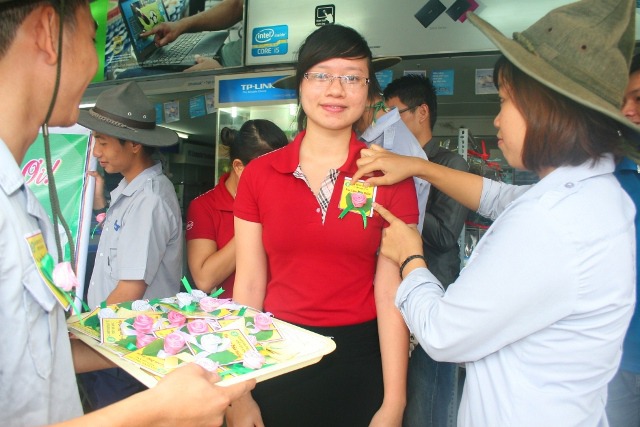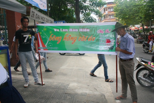 Với tinh thần hội nhập, với mong muốn chia sẽ những cung bậc cảm xúc khi nghĩ về công ơn Cha Mẹ đến với tất cả mọi người trong xã hội, sáng hôm nay, ngày 19/8/2013 (13/7/Quý Tỵ), Huynh trưởng và đoàn sinh GĐPT Viên Quang đã tổ chức chương trình BÔNG HỒNG XUỐNG PHỐ. 800 chiếc hoa hồng đã được các Huynh trưởng và đoàn sinh cài tặng cho tất cả bà con tại khu vực chợ Tân Lập, các hộ dân dọc đường Phạm Văn Nghị, Hàm Nghi, Trần Tống và sinh viên trường Đại học Duy Tân.
