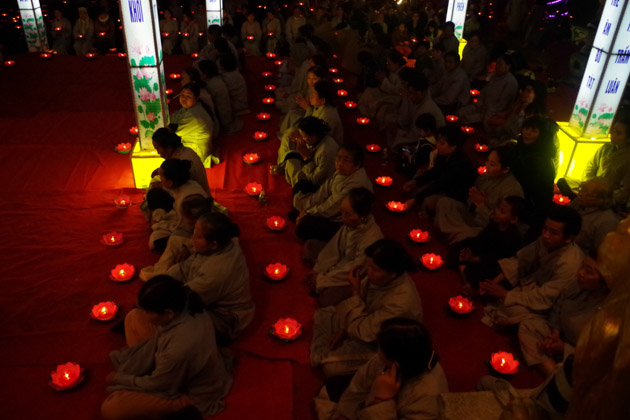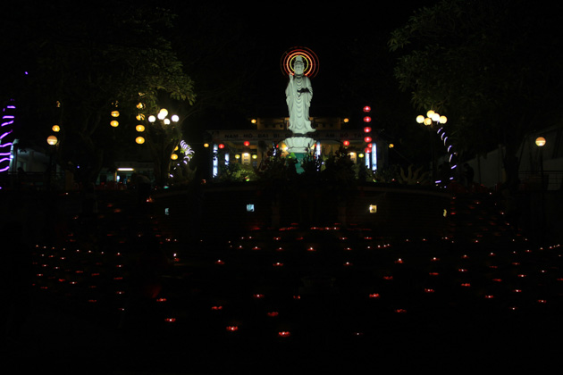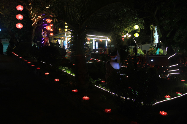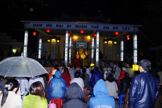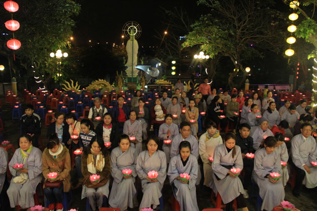 Tối cùng ngày, dưới sự chứng minh của TT. Thích Huệ Đạo – Trú trì chùa Hòa Thọ; ĐĐ. Thích Hải Trí – Tri sự chùa Hòa Thọ, đêm hoa đăng cúng dường ngày khánh đản Bồ Tát Quán Thế Âm đã diễn ra trang nghiêm với sự tham dự của hàng trăm đạo hữu Phật tử dù thời tiết không được thuận lợi.