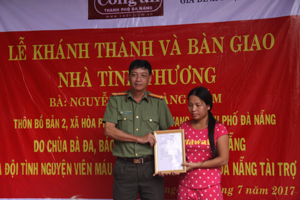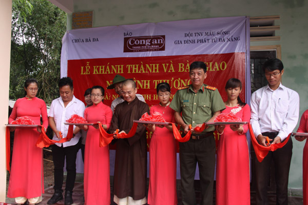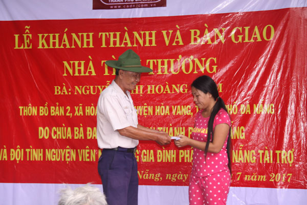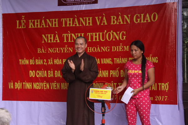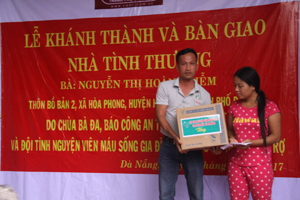 Tại buổi lễ khánh thành, chùa Bà Đa và Đội TNV máu sống GĐPT Đà Nẵng đã trao tặng quà chúc mừng gia đình chị Diễm, mong muốn gia đình phấn đấu thoát nghèo để ổn định cuộc sống.