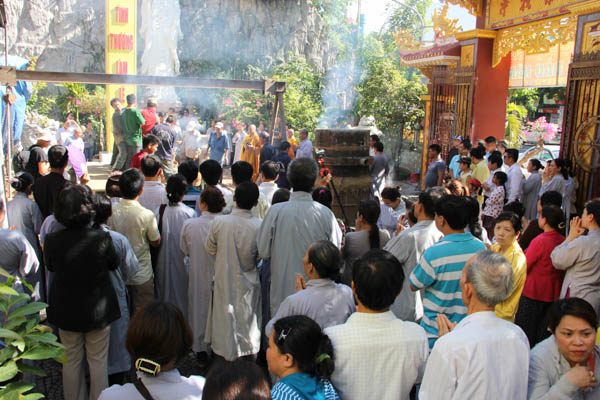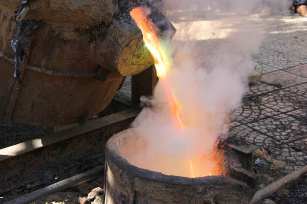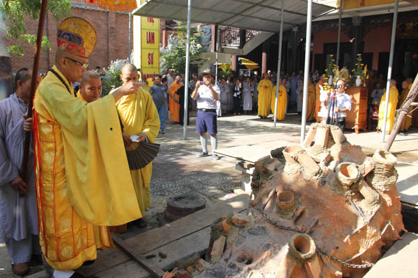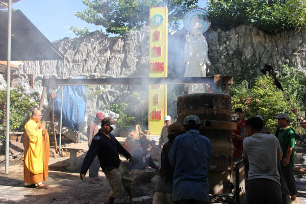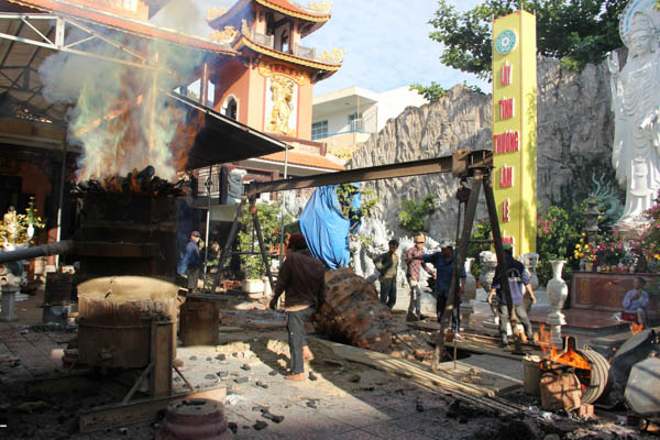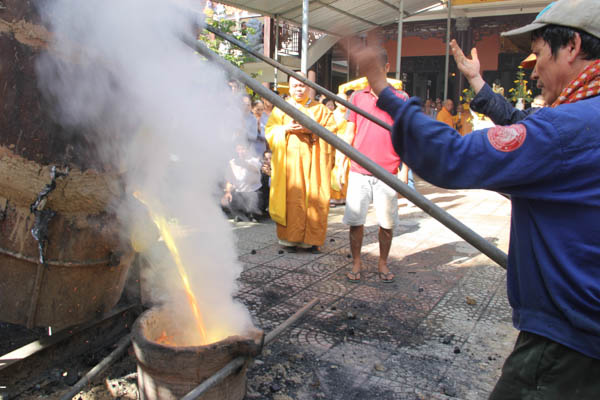 Đúng 8h00 sáng, các nghệ nhân đã đổ đồng vào khuôn trong tiếng niệm Phật A Di Đà của Chư Tăng Ni và Phật tử.