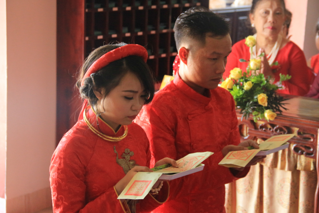 Đôi nhẫn cưới tượng trưng cho sự viên dung, bền chắc của tình nghĩa vợ chồng được đôi tân lang tân nương trao cho nhau trước sự chứng minh của Tam Bảo và sự chứng kiến của bà con hai họ với một niềm tin vào tương lai tươi sáng, một mái ấm gia đình hạnh phúc mãi mãi.
