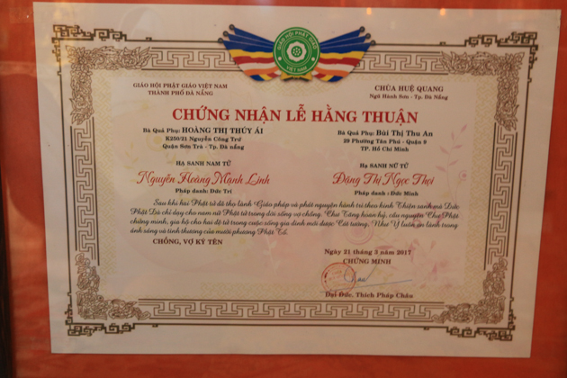 Sáng ngày 21/03/2017 (24/02 Đinh Dậu), tại chùa Huệ Quang (Phường Hòa Hải, Quận Ngũ Hành Sơn, Tp Đà Nẵng) đã trang nghiêm tổ chức lễ hằng thuận cho đôi bạn trẻ: Nguyễn Hoàng Mạnh Linh – Đặng Thị Ngọc Thọi dưới sự chứng minh của ĐĐ. Thích Pháp Châu – Phó thư ký kiêm Phó văn phòng BTS GHPGVN Tp Đà Nẵng, Trú trì chùa Huệ Quang cùng Chư Đại đức Tăng.