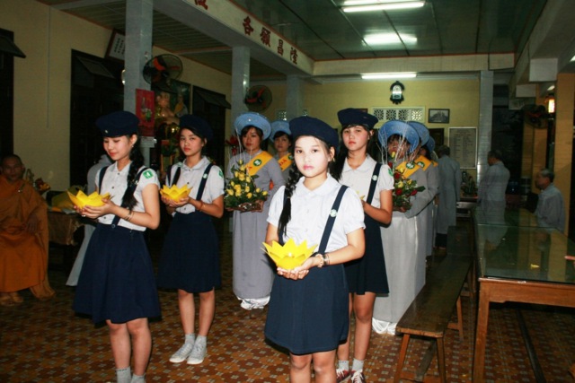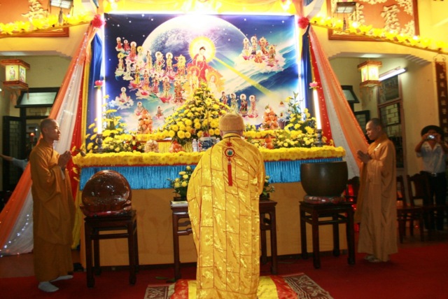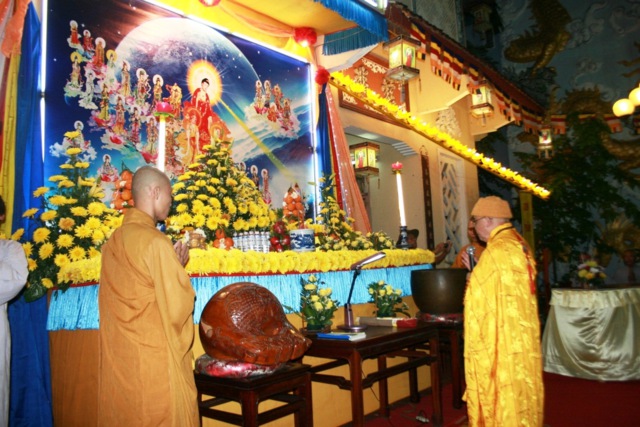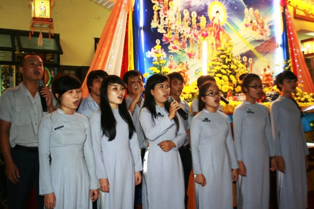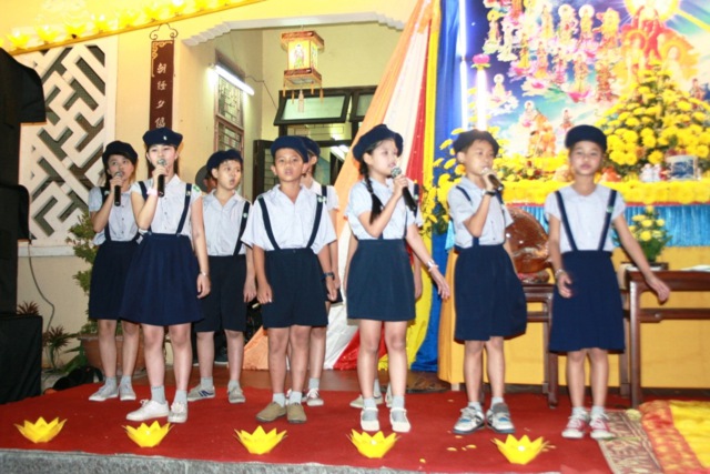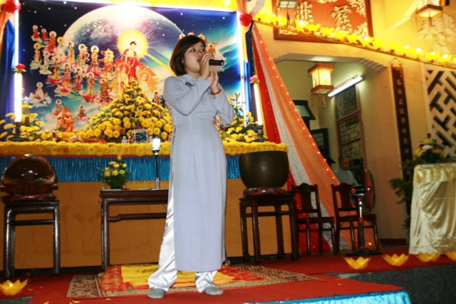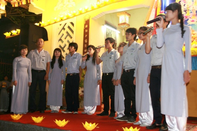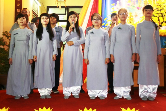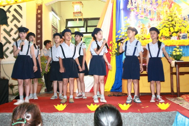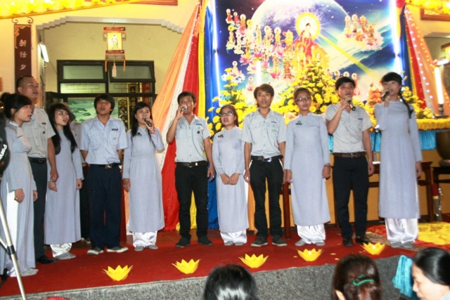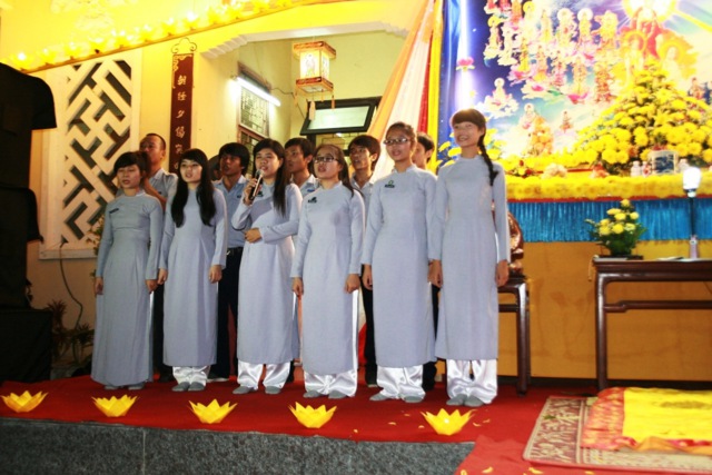 Tiếp theo, Thượng tọa Thích Minh Thành đã niêm hương bạch Phật và tiến hành nghi lễ cúng dường. Các tiết mục văn nghệ do Huynh trưởng và đoàn sinh GĐPT Viên Quang biểu diễn đã tăng thêm không khí đầm ấm trang nghiêm của buổi lễ.