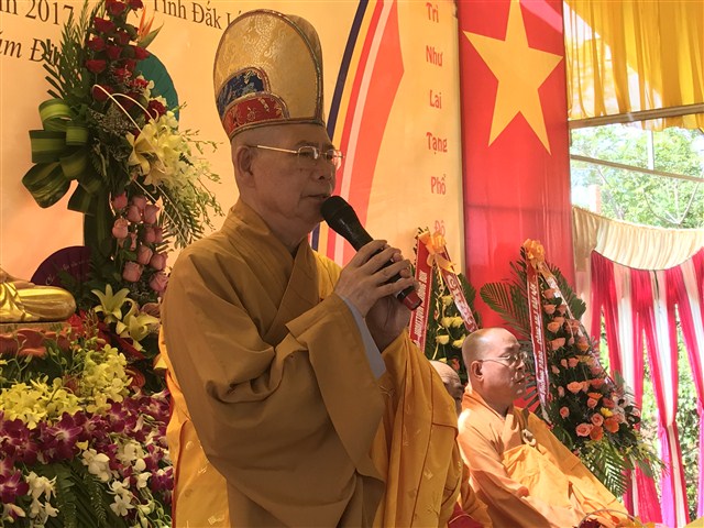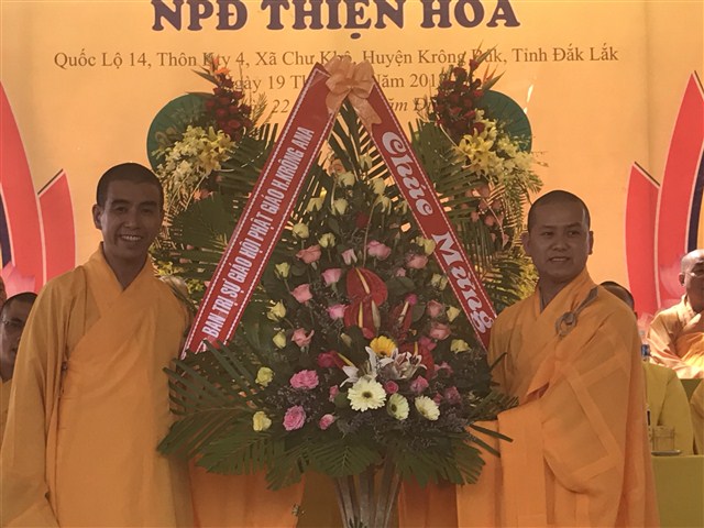 “ Phật giáo là tôn giáo hoà bình luôn đồng hành cùng hơi thở nhịp đập của đảng, nhà nước và dân tộc, đóng góp rất lớn vào phong trào hộ quốc, an dân, đem lại đời sống tinh thần, vật chất ấm no hạnh phúc cho bà con phật tử và nhân dân. Tôi mong mỏi chính quyền cùng bà con phật tử nhân dân địa phương cùng chăm lo đời sống tinh thần vật chất cho người dân, nhất là ủng hộ các công việc Phật sự tại NPĐ Thiện Hoà, trụ sở của Ban trị sự GHPGVN huyện Krông Buk, cùng nhau xây dựng nếp sống văn hoá tinh thần đạo đức đoàn kết toàn dân, đưa phong trào văn hoá, kinh tế địa phương ngày càng phát triển, xây dựng đất nước Việt Nam giàu mạnh, văn minh, hiện đại” – Hoà thượng ban đạo từ chia sẻ.