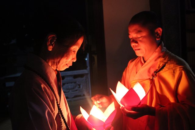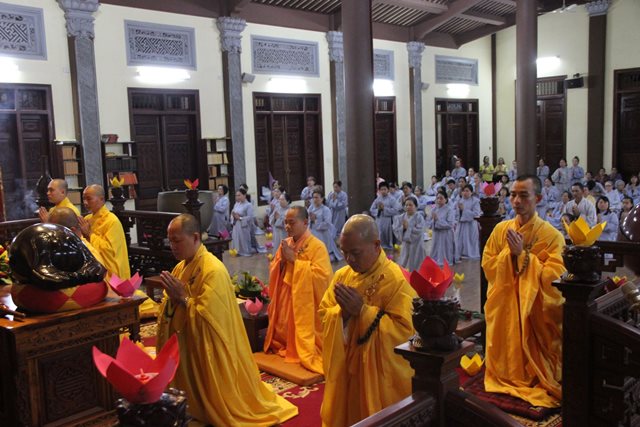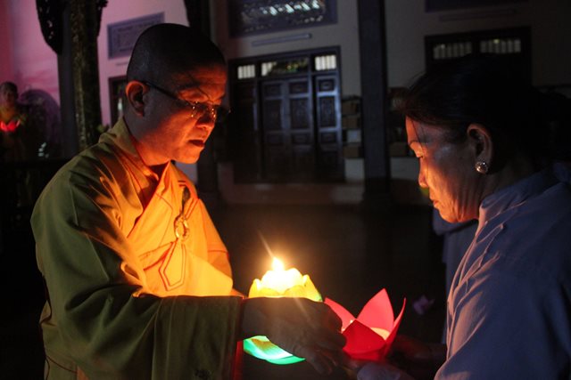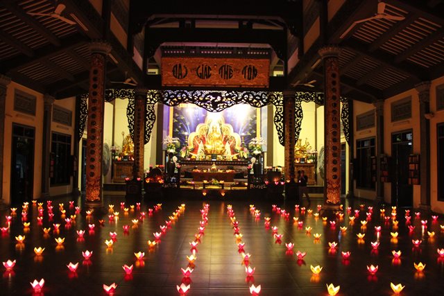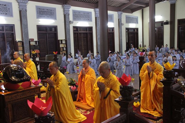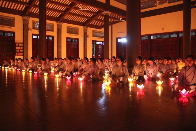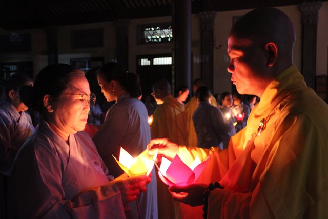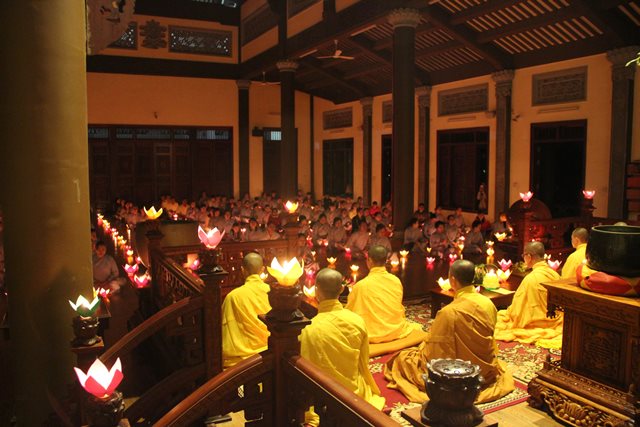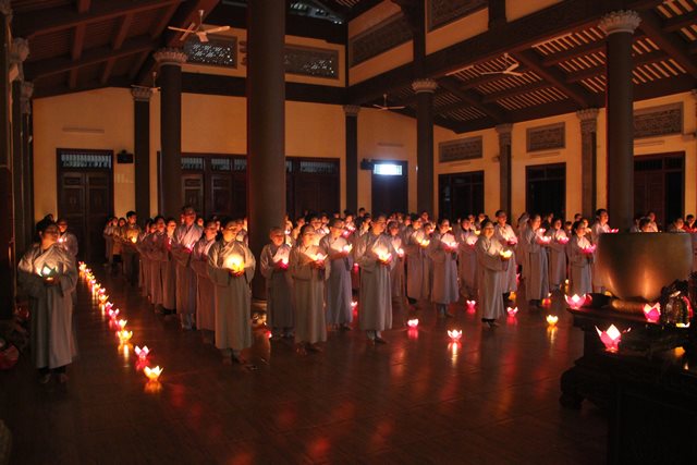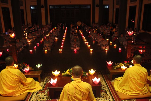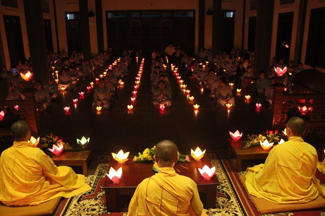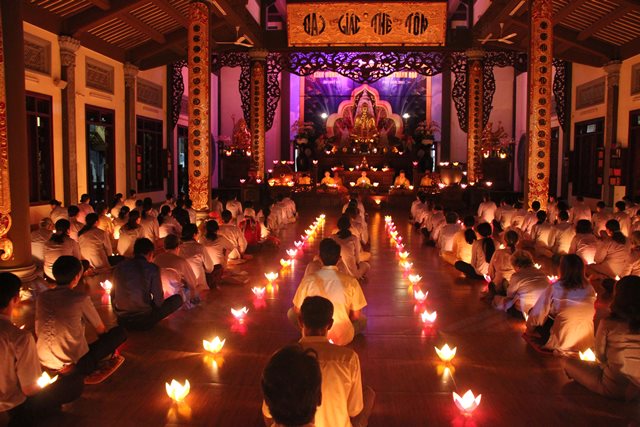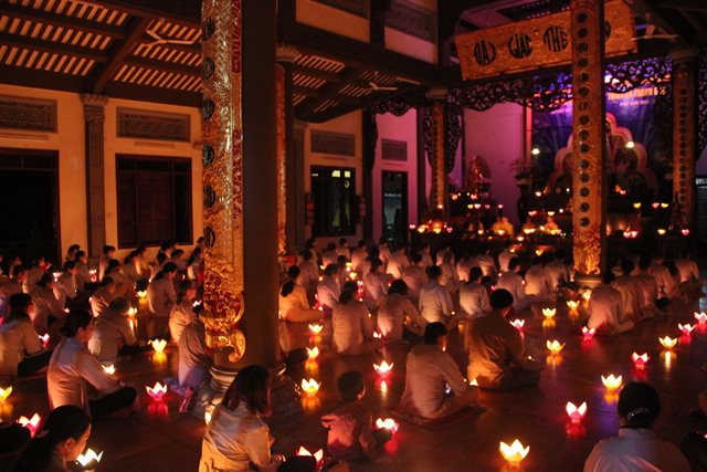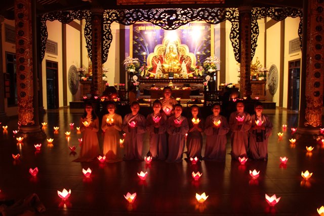 Những nhánh hoa tươi thơm ngát, những ngọn nến sáng lung linh và lời kinh trầm bổng, tứ chúng dâng trầm hương đốt, đãnh lễ thiết tha, trang nghiêm thiền tọa và cùng ôn lại cuộc đời Đức Phật.