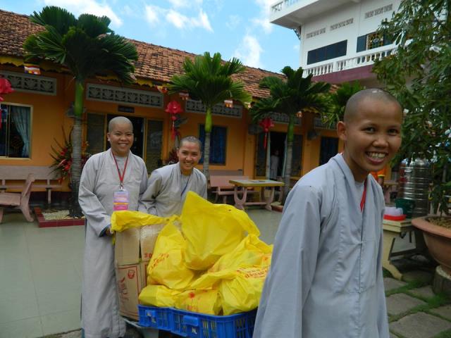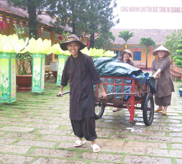 Nhiều lúc quý vị ấy phải rửa bát, dọn vệ sinh, lao tác bất cứ khi nào công việc cần. Những việc như nhặt rau, đẩy củi, vận chuyển đồ bằng xe kéo đều diễn ra tất bật trong mưa. Đêm nào họ cũng thức thật khuya, bửa nào cũng ăn thật muộn, mỗi ngày phải thay mấy bộ đồ vì làm việc dưới mưa. Chương trình đàn giới liên tục diễn ra, tiến độ công việc ngày một dày đặc, nhưng các tiểu ban chưa bao giờ trể nãi công tác mà BTC đã đề ra. Dù vậy trên môi mỗi người vẫn luôn nở nụ cười hoan hỷ trong từng công việc của mình.