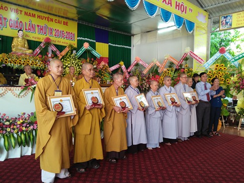 Nhân dịp này, đại diện các cơ quan ban ngành chính quyền tỉnh Tiền Giang và huyện Cái Bè đã trao tặng bằng khen cho các tập thể, cá nhân Tăng Ni, Phật tử có công đóng góp tích cực vào công tác Phật giáo nhiệm kỳ 2011-2016.
