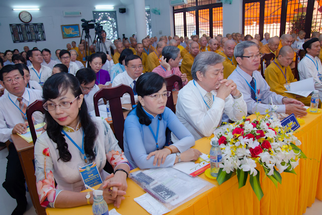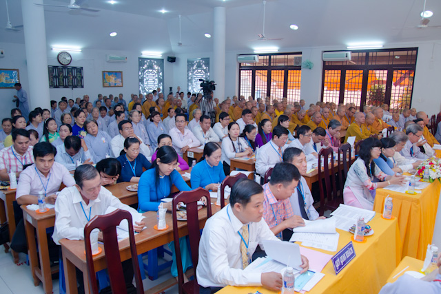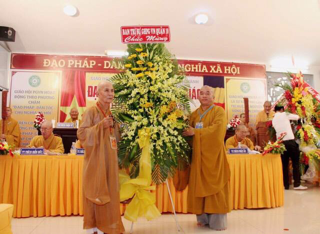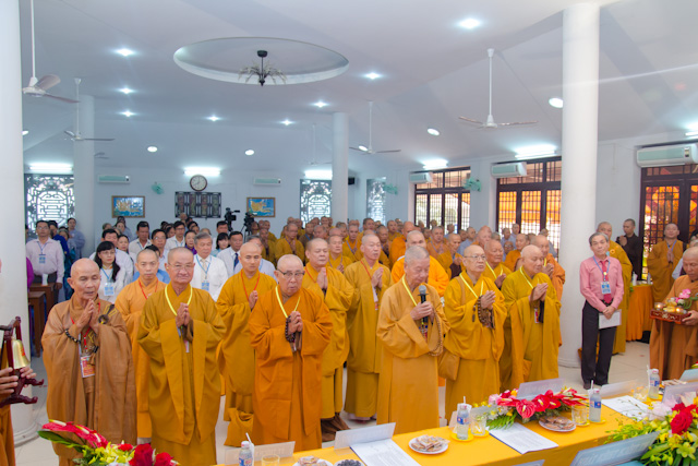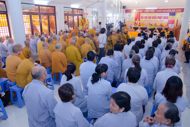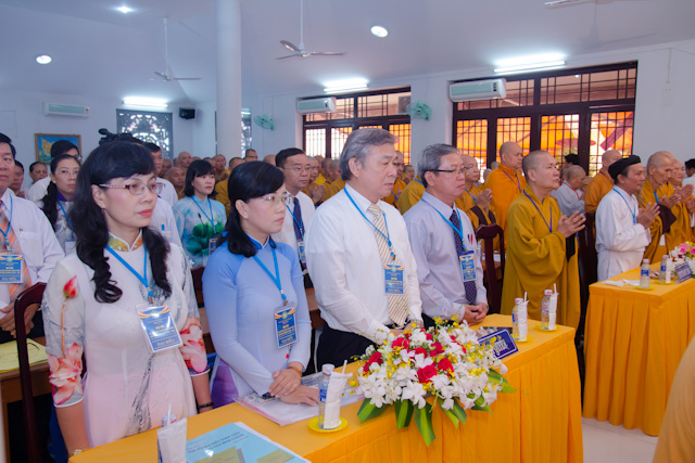 Trước khi vào chương trình Đại hội, Đại biểu đã cử hành nghi thức lễ chào Quốc kỳ, đạo kỳ và dành một phút tưởng niệm Chủ tịch Hồ Chí Minh kính yêu, chư anh linh AHLS, tiền bối hữu công đã ngã xuống cho dân tộc và đạo pháp được trường tồn.