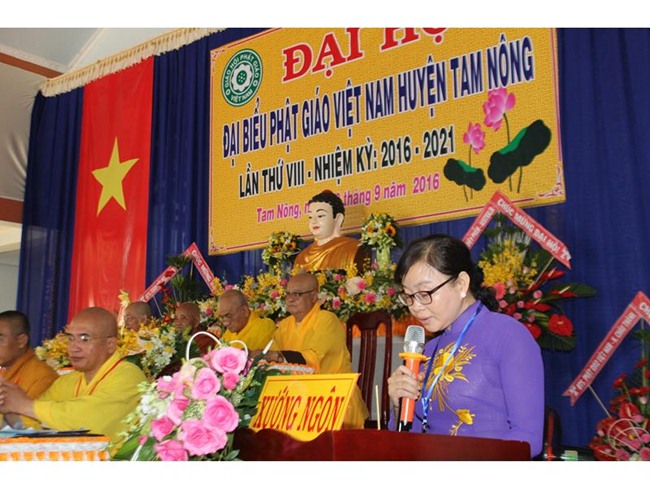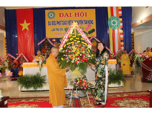 Nhân dịp này đại diện Chánh quyền Bà Lê Thị Thùy Dương phó chủ Tịch UBND Huyện Tam Nông có lời chúc mừng đến Đại hội tổ chức thành công với sự chuẩn bị tốt trong khi diễn ra, đánh giá cao về thành tựu thế sự và Phật sự trong nhiệm kỳ qua. Với 6.000 tín đồ trong địa bàn huyện, Tân BTS phải thực hiện hoằng pháp, hướng dẫn tín đồ với sự đoàn kết toàn dân tộc, ra sức bảo tồn văn hóa, làm tốt công tác từ thiện xã hội, thực thiện chủ chương đường lối của Đảng và nhà Nước….