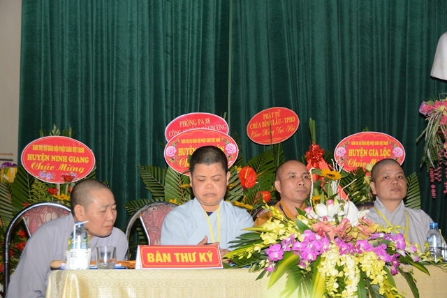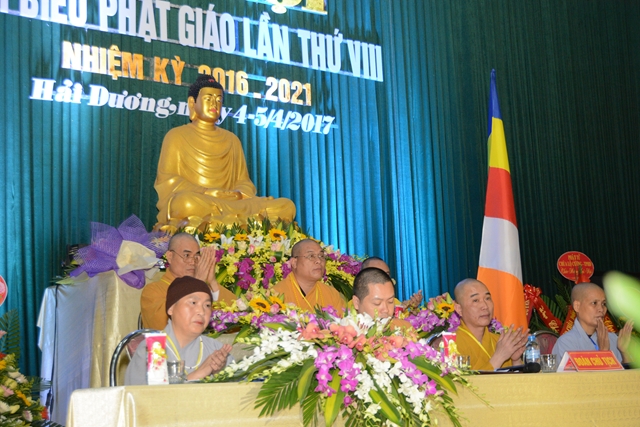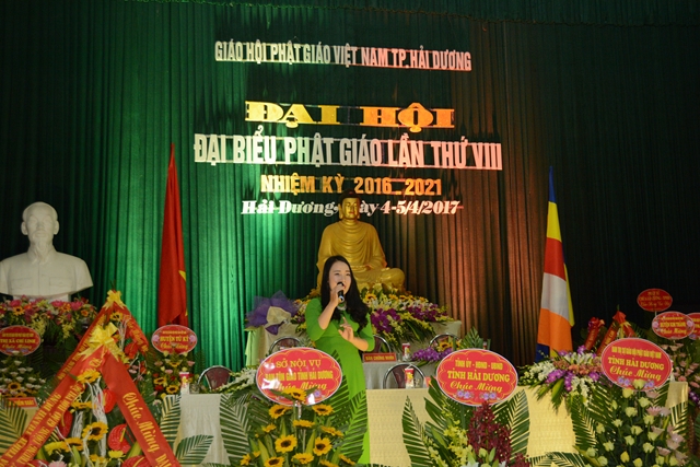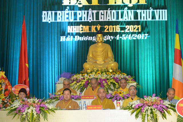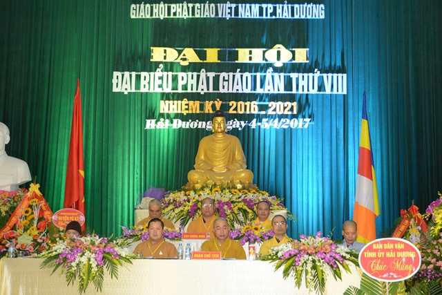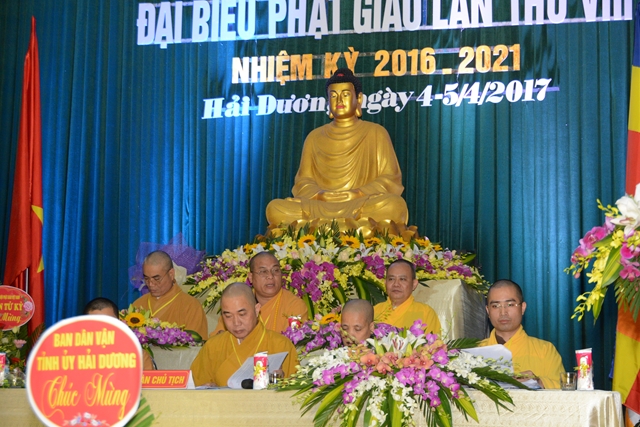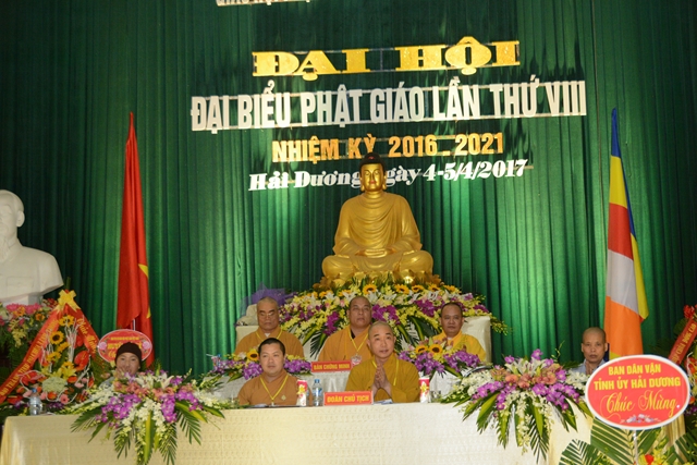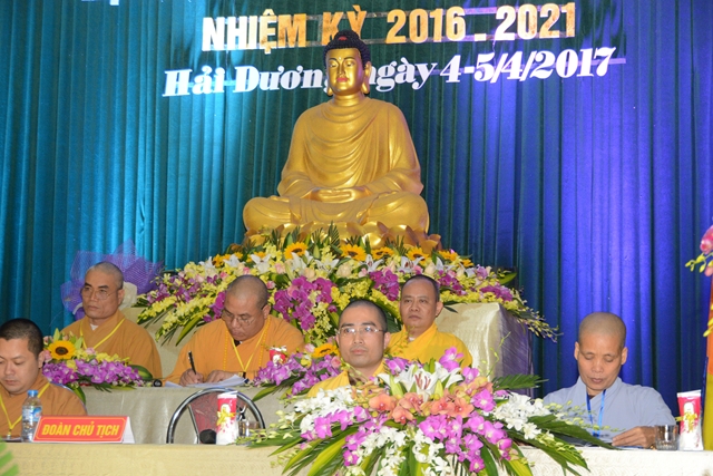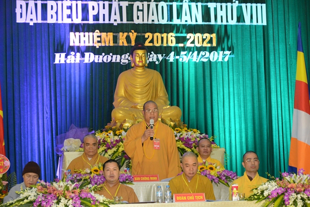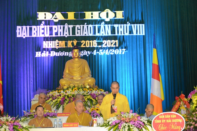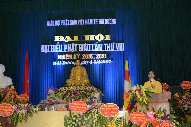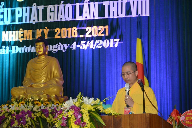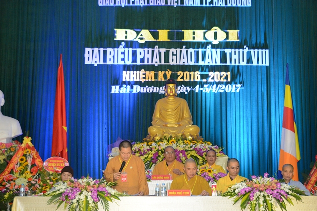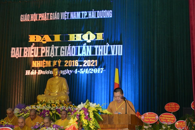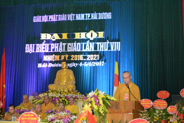 Tiếp đó, Đại đức Thích Thanh Long – Phó BTS GHPGVN thành phố Hải Dương nhiệm kỳ VII đã lên tuyên đọc dự thảo báo cáo tổng kết công tác Phật sự nhiệm kỳ VII (2012-2016) và trình bày phương hướng hoạt động Phật sự nhiệm kỳ VIII (2016-2021) của Ban trị sự GHPGVN thành phố Hải Dương. Trong nhiệm kỳ vừa qua, BTS GHPGVN thành phố Hải Dương dưới sự chỉ đạo trực tiếp của BTS GHPGVN tỉnh, đã thành tựu được nhiều hoạt động Phật sự trọng đại, có đường lối hoạt động đúng đắn theo phương châm: “ Đạo Pháp – Dân tộc – Chủ nghĩa xã hội”, phát huy tinh thần “ Đoàn kết – Hòa hợp – Trưởng dưỡng đạo tâm – Trang nghiêm giáo hội, Ban trị sự đã chỉ đạo, kết hợp cùng chư tôn đức Tăng Ni trụ trì các cơ sở tự viện, tích cực hoạt động và đã đạt được nhiều thành quả khả quan trong các công tác Phật sự – xã hội, khẳng định được niềm tin sâu sắc của các Tự viện, Tăng Ni và Phật tử đối với Giáo hội.