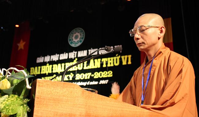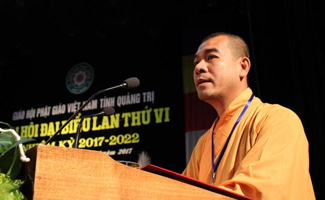 Diễn văn nhấn mạnh Đại hội Đại biểu GHPGVN tỉnh Quảng Trị lần thứ VI NK 2017-2022 mang một chủ đề Ổn định-Củng cố-Phát triển. Vì vậy Đại hội sẽ tập trung thảo luận để xây dựng một chương trình hoạt động Phật sự cho cả nhiệm kỳ vừa thực tế, vừa khả thi đúng chủ đề đồng thời suy cử một Ban Trị sự đủ phẩm chất đạo đức, năng lực để lãnh đạo và điều hành Giáo hội…