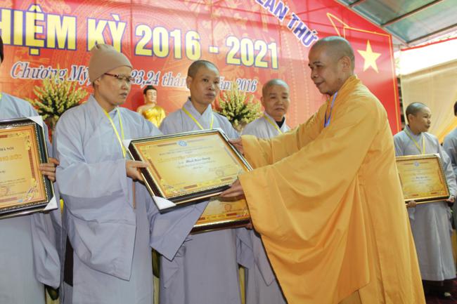 Sau đó, Đại đức Thích Tiến Thông – Uỷ viên thường trực BTS GHPGVN TP. Hà Nội, Trưởng ban Hướng dẫn Phật tử đã đọc quyết định khen thưởng của BTS Phật giáo huyện Chương Mỹ.