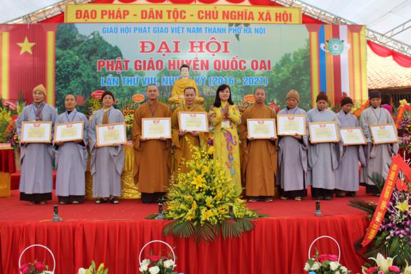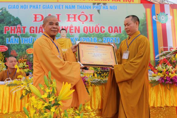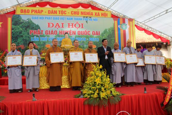Sau đó, Đại đức Thích Đạo Phong – Uỷ viên HĐTS GHPGVN Phó Thư ký kiêm Phó văn phòng BTS GHPGVN TP. Hà Nội đã đọc quyết định khen thưởng cho BTS Phật giáo huyện Quốc Oai. TT Thích Thanh Chính đã thay mặt BTS GHPGVN thành phố Hà Nội trao bằng tuyên dương công đức cho những tập thể và cá nhân xuất sắc. Cũng nhân dịp này, các cá nhân và tập thể của BTS Phật giáo huyện Quốc Oai cũng đã đón nhận bằng khen của UBND – UBMTTQ huyện trao tặng.