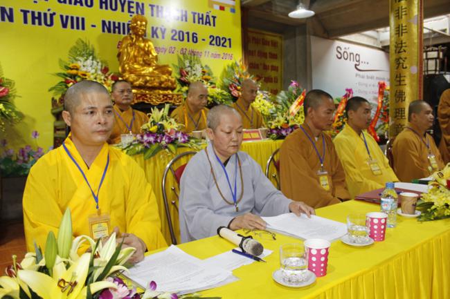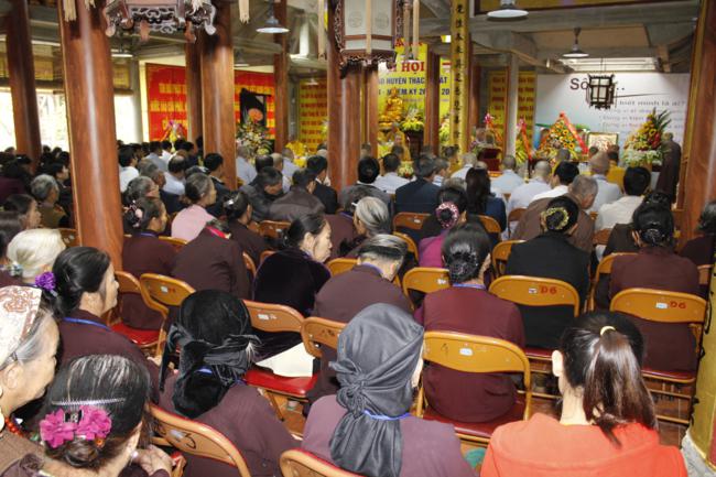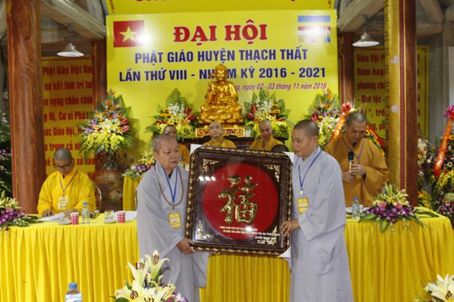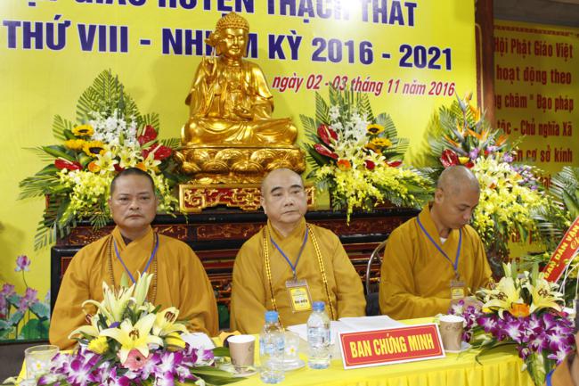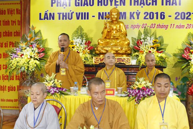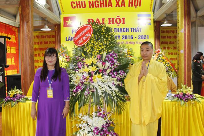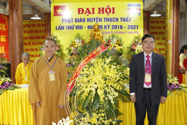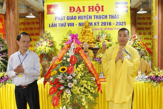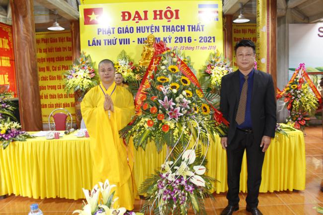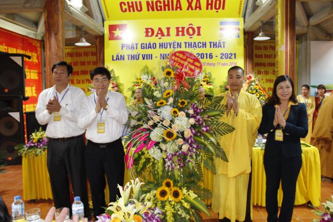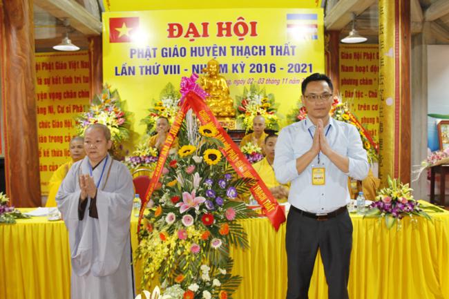 Tại đại hội, ông Kiều Hoàng Tuấn – Phó Chủ tịch UBND huyện Thạch Thất có vài lời phát biểu và tặng hoa chúc mừng. Trong lời phát biểu, ông hy vọng Phật giáo huyện Thạch Thất trong thời gian tới quan tâm hơn nữa đến việc tăng cường đoàn kết, hòa hợp, củng cố, mở rộng và trang nghiêm Phật pháp, thắt chặt mối quan hệ gắn bó giữa các thành viên, với Ban Trị sự Phật giáo ở các quận, huyện trong Thành hội góp phần giữ gìn, phát huy bản sắc văn hóa Phật giáo Việt Nam. Đó cũng là sự thể hiện tốt phương châm hoạt động “Đạo pháp – Dân tộc – Chủ nghĩa xã hội” và tinh thần “Phục vụ chúng sinh là cúng dàng chư Phật”.